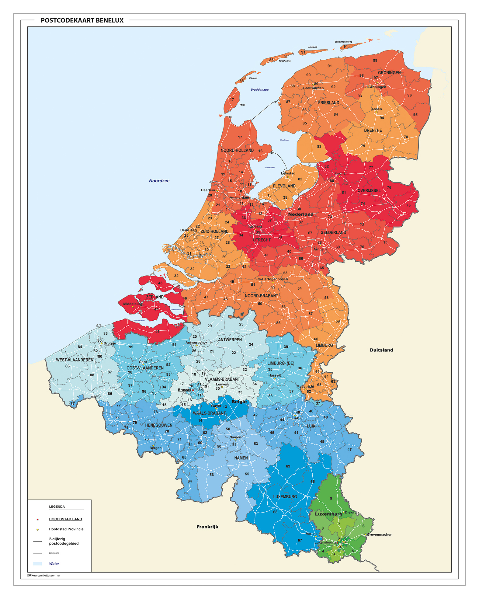 • Duidelijke 2-cijferige postcodekaart van de Benelux met legenda