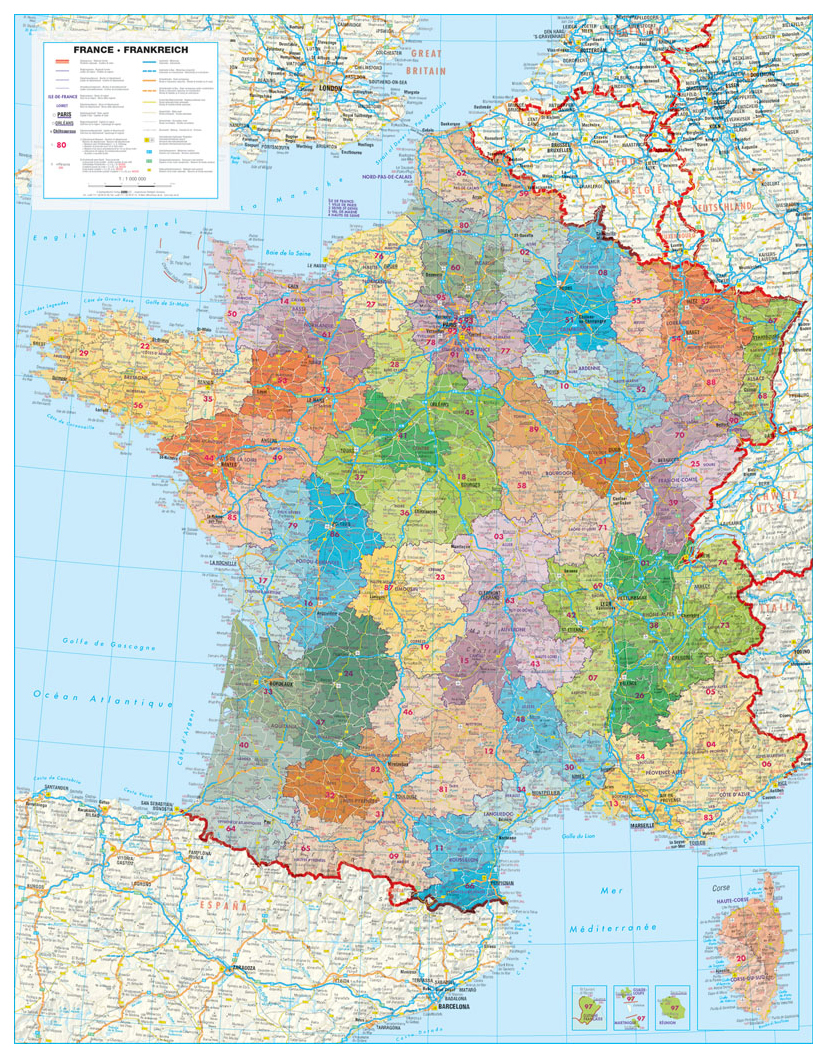 Zeer uitgebreide postcodekaart van Frankrijk. De postcodegebieden zijn overzichtelijk door het kleurgebruik. Met legenda in Franse en Duitse taal.