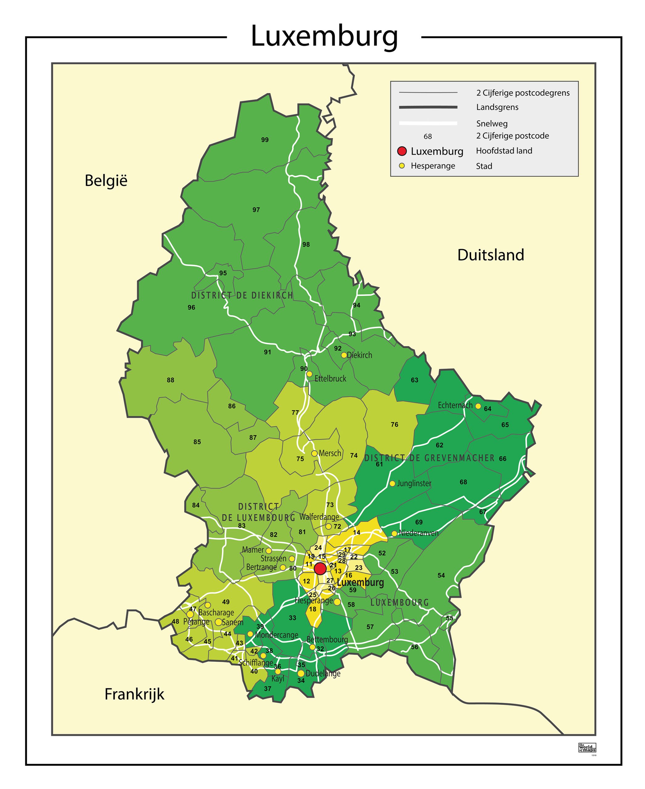2-cijferige Postcodekaart van Luxemburg. Alle gebieden met identieke begincijfers hebben dezelfde kleur. Met duidelijke legenda.