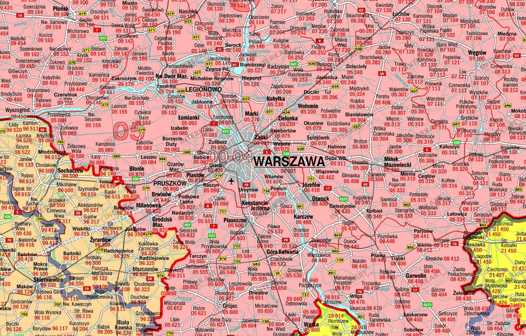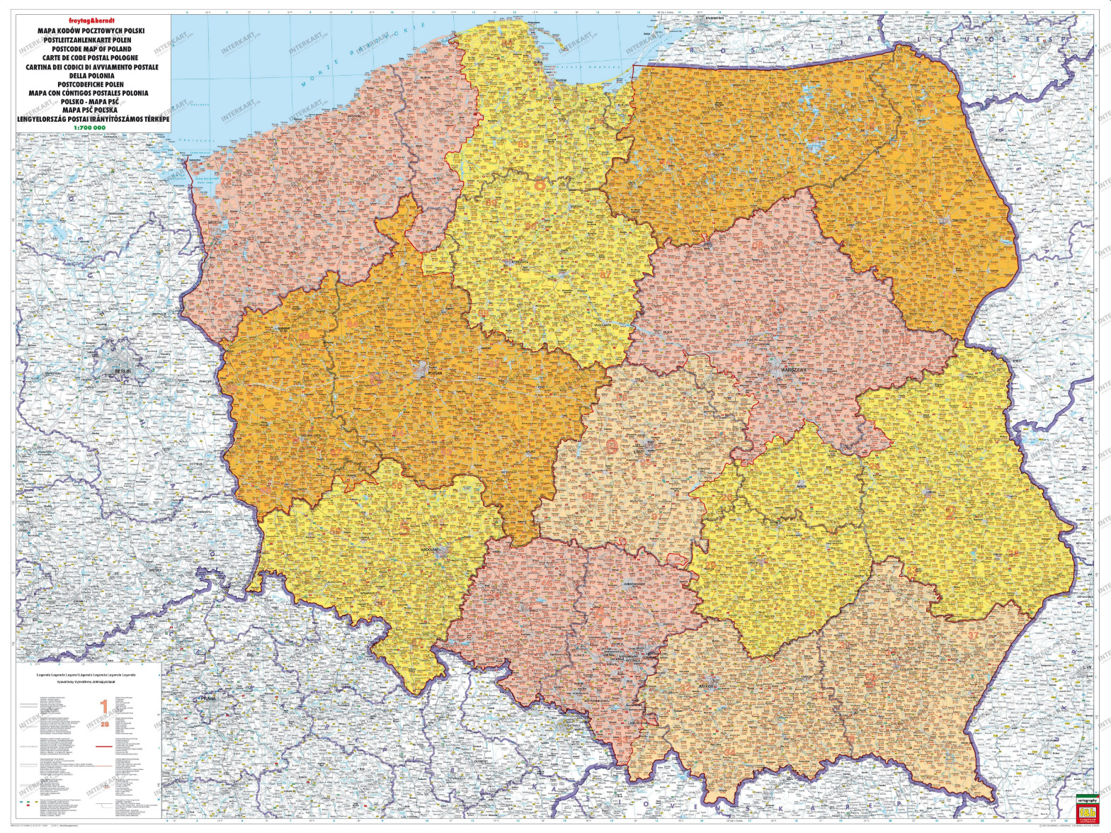 Zeer uitgebreide postcodekaart. De kaart is beschrijfbaar en afwasbaar. Schaal 1:700.000. Met duidelijke legenda. Formaat 125×93,5 cm.