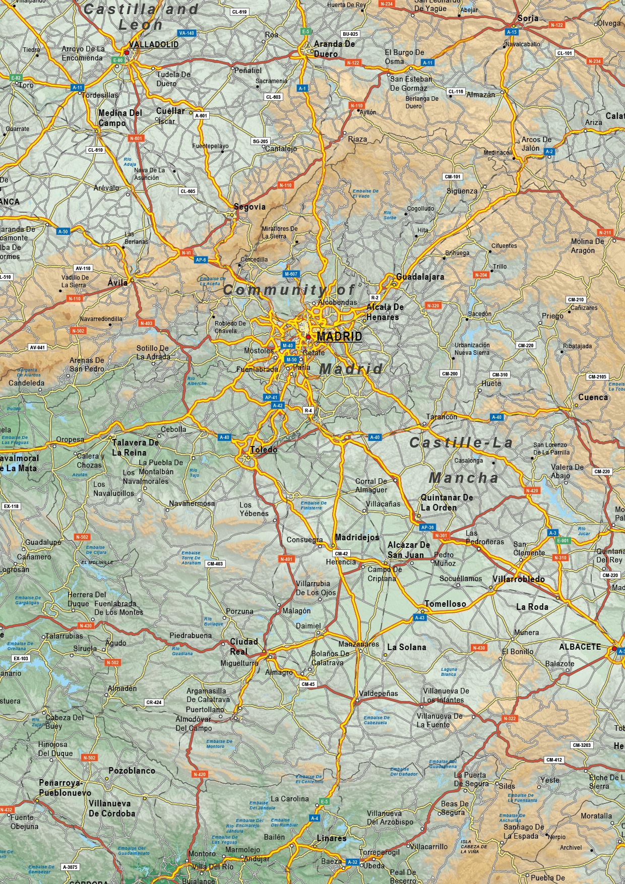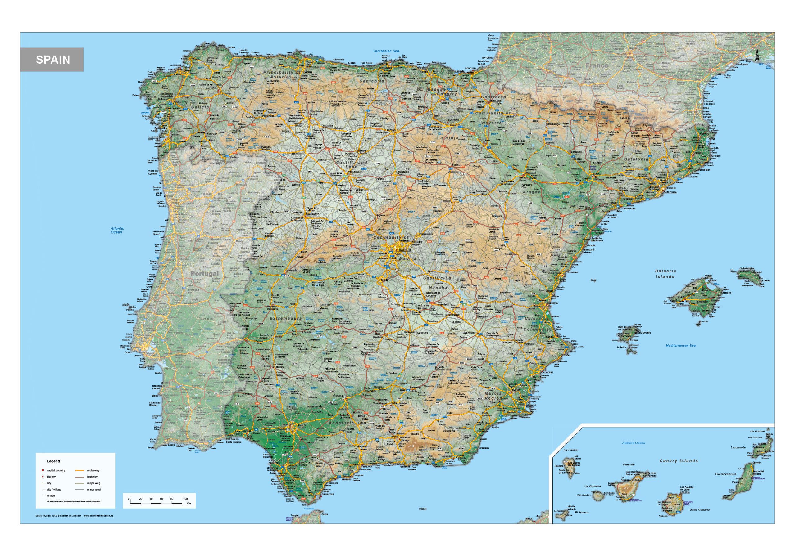 Engelstalige natuurkundige kaart van Spanje met veel informatie. Veel steden, dorpen, wegen, spoorwegen en wateren staan op de kaart. De belangrijkste wegennummers zijn genoemd. Alle provincies en provinciegrenzen zijn aangegeven. Bebouwing en grondgebruik zijn duidelijk te zien door de kleuren. De kaart is er ook in een staatkundige versie.