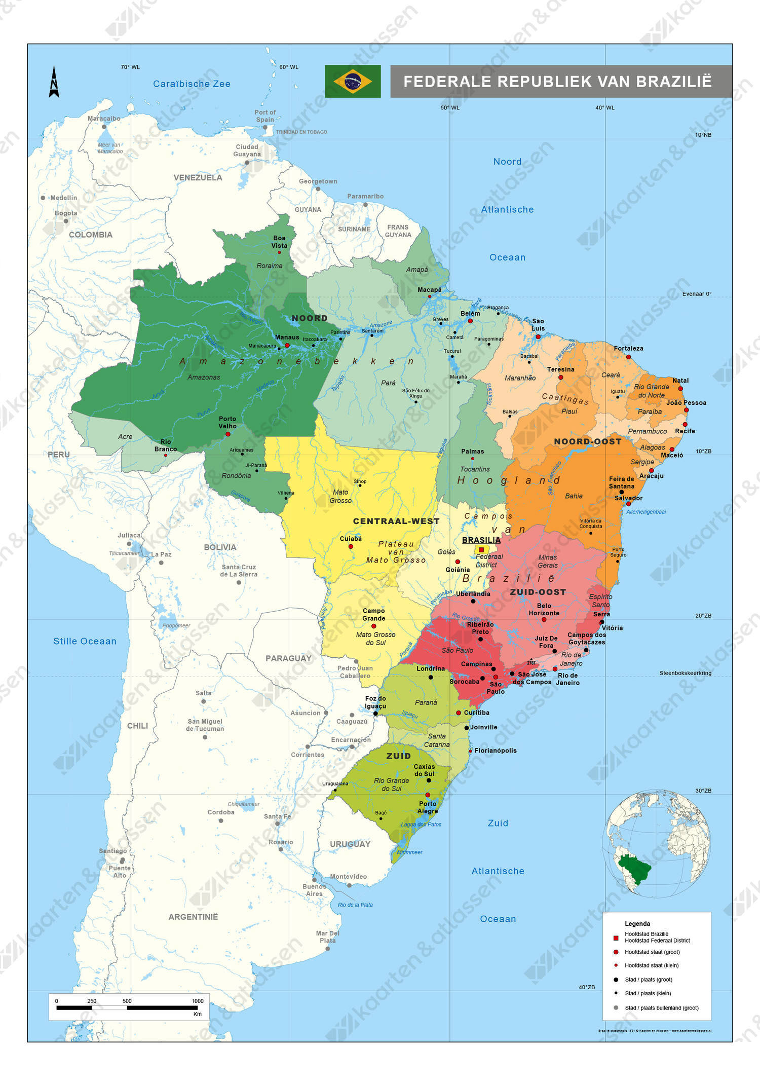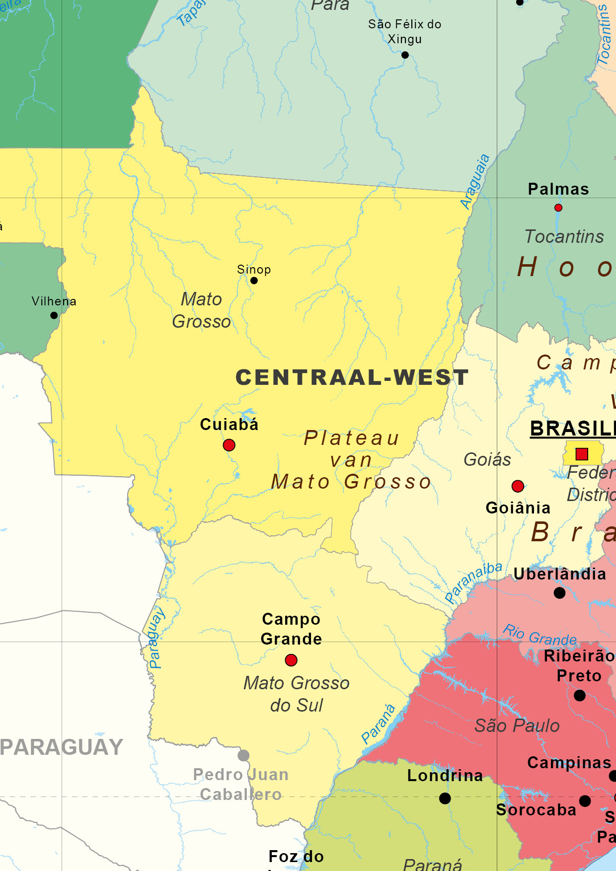 Staatkundige kaart van Federale Republiek van Brazilië waarop regio’s en deelstaten goed naar voren komen door het kleurgebruik. De hoofdstad van elke deelstaat is op de kaart geplaatst. Daarnaast staan ook andere grote en kleine plaatsen en wateren aangegeven.