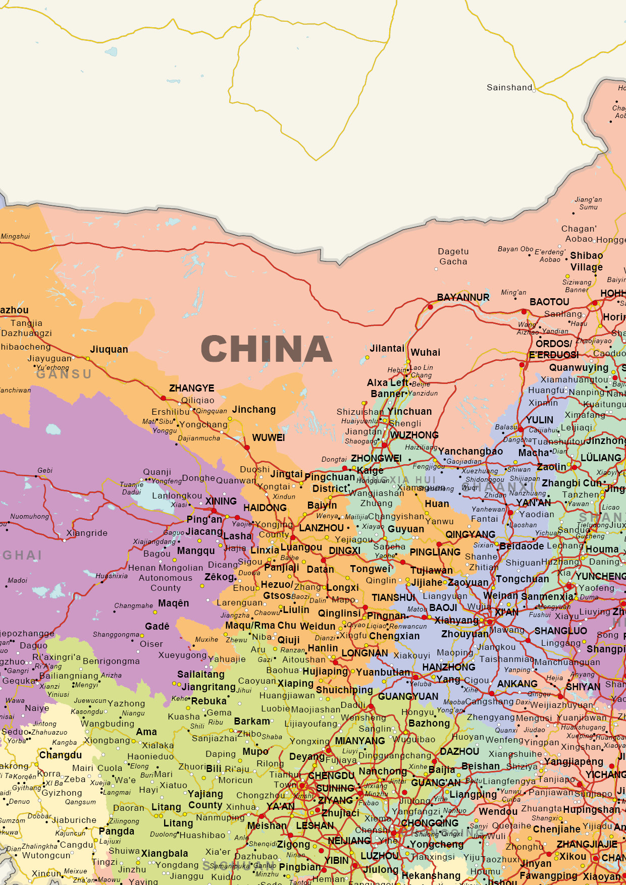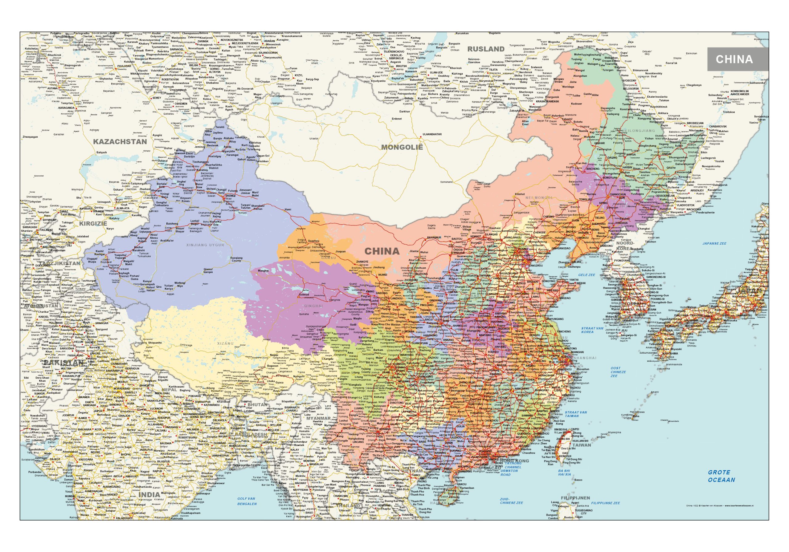 Een duidelijke wegenkaart van China waarop alle provincies zijn weergegeven. Met veel plaatsnamen.