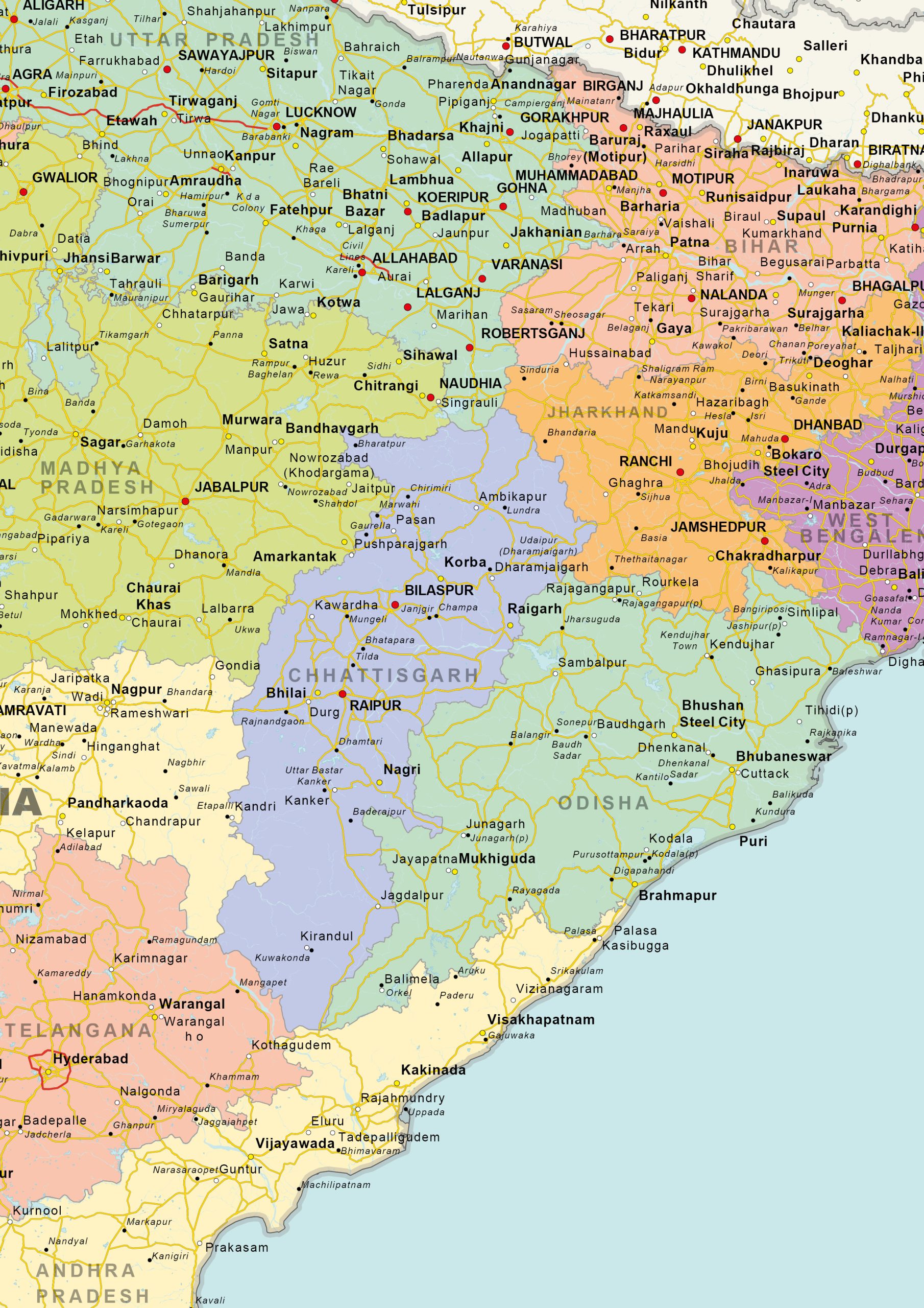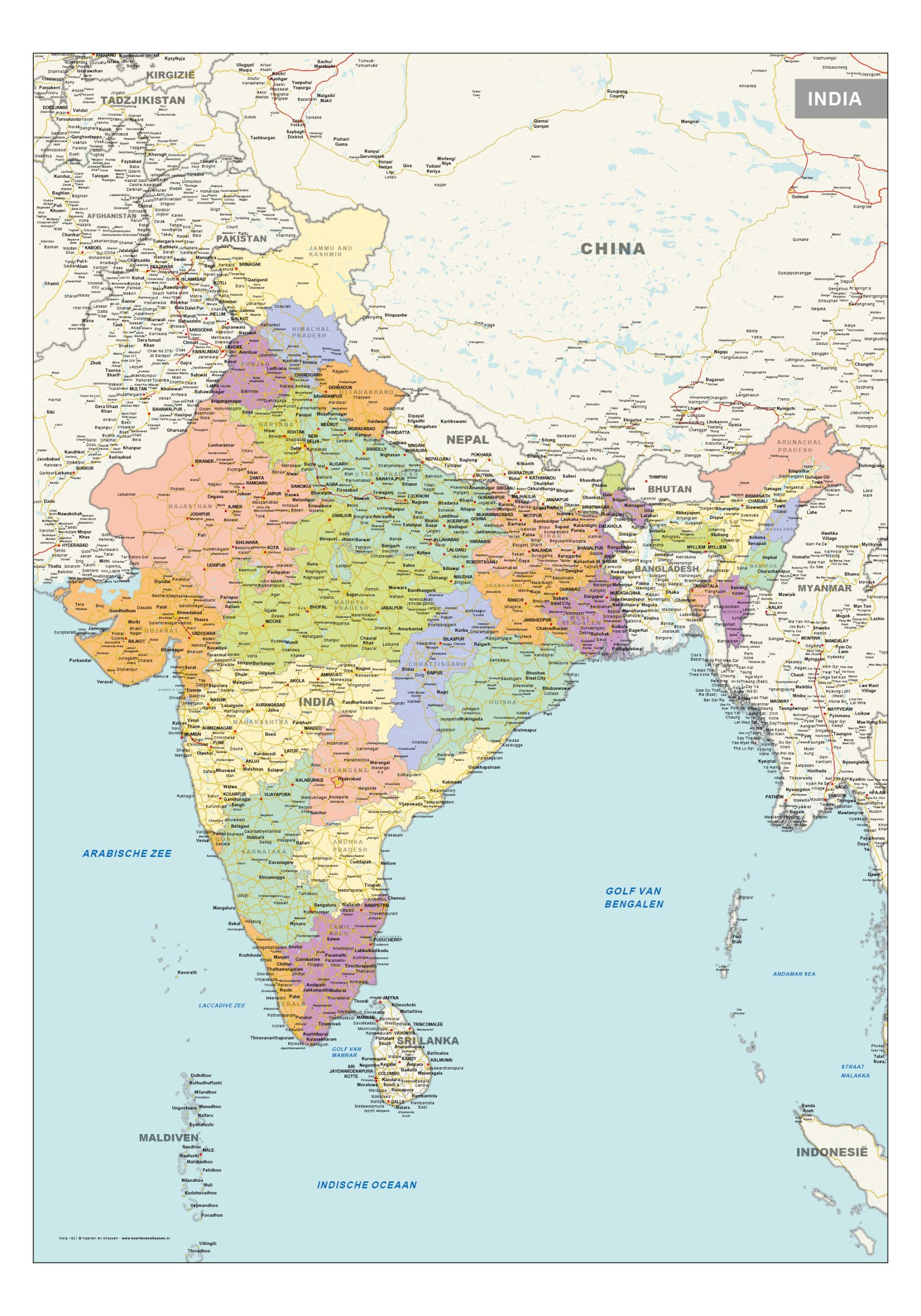 Een duidelijke wegenkaart van India waarop alle deelstaten zijn weergegeven.
