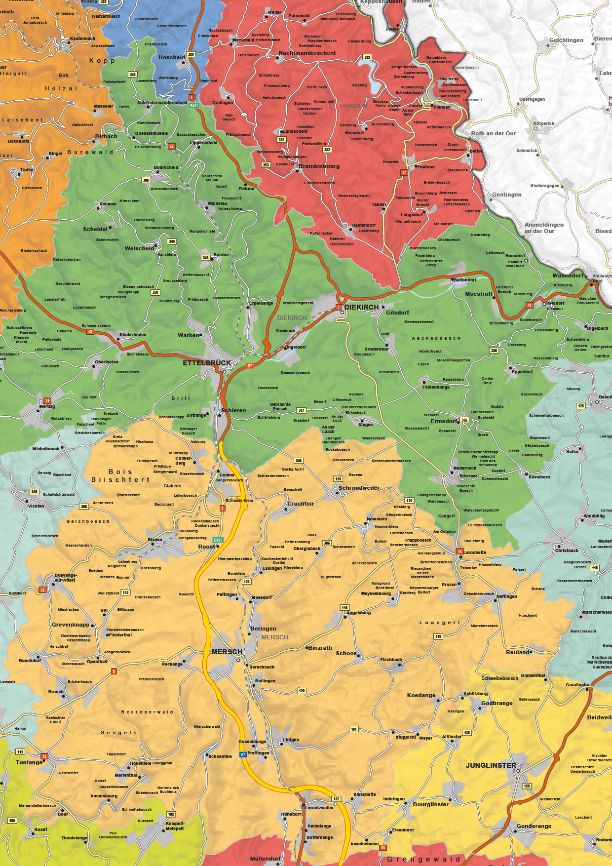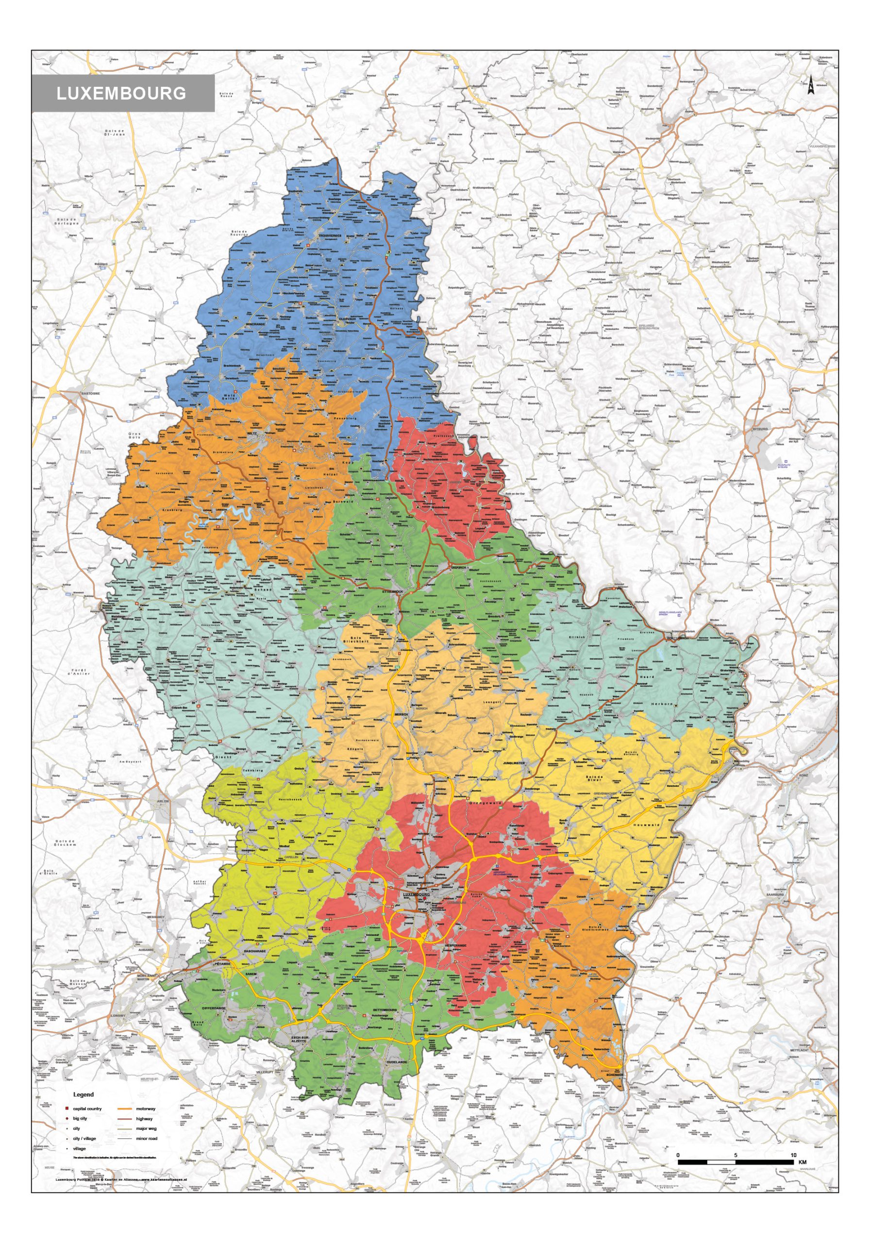 Engelstalige staatkundige kaart van Luxemburg met veel informatie. Alle landsgrenzen, provinciegrenzen en hoofdsteden staan op de kaart. Veel steden, dorpen, autowegen, snelwegen, hoofdwegen en kleinere wegen zijn weergegeven. Met duidelijke legenda. De kaart is ook als natuurkundige Luxemburgkaart te koop.
