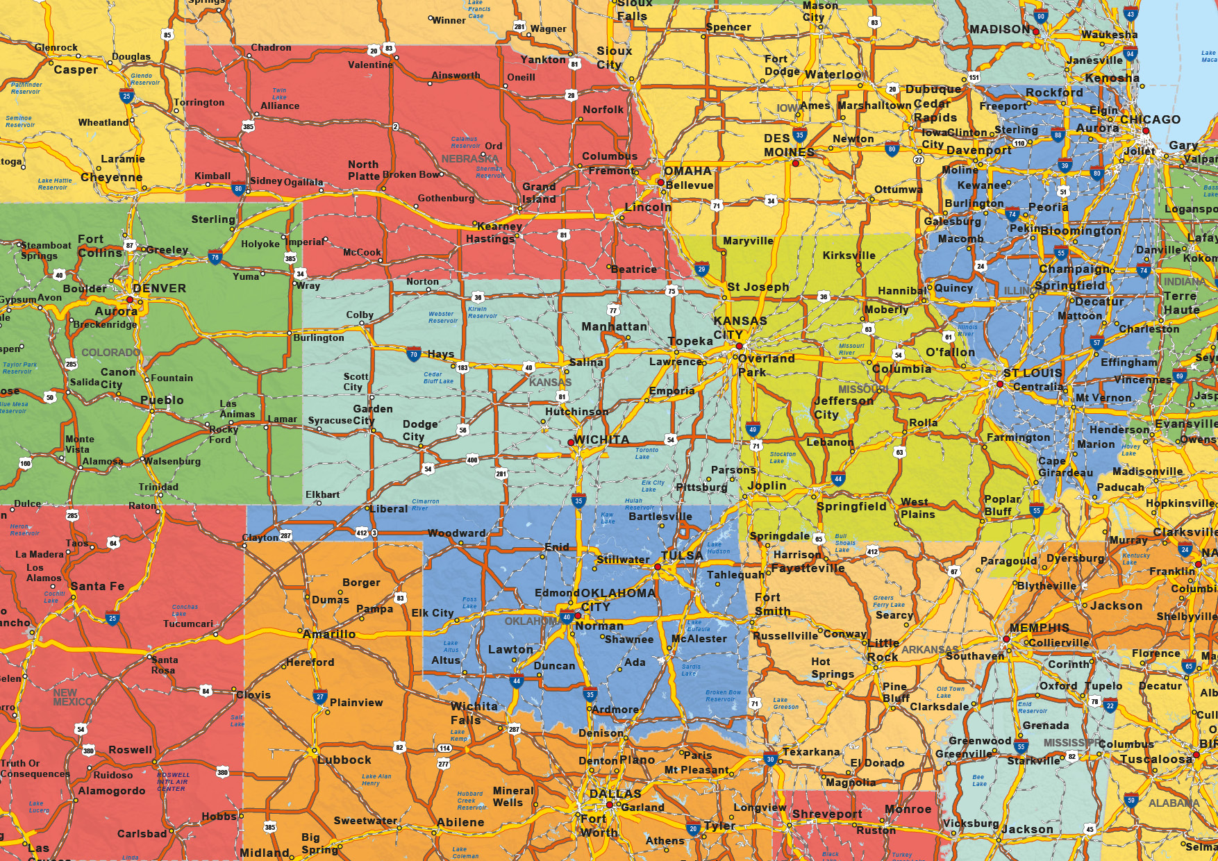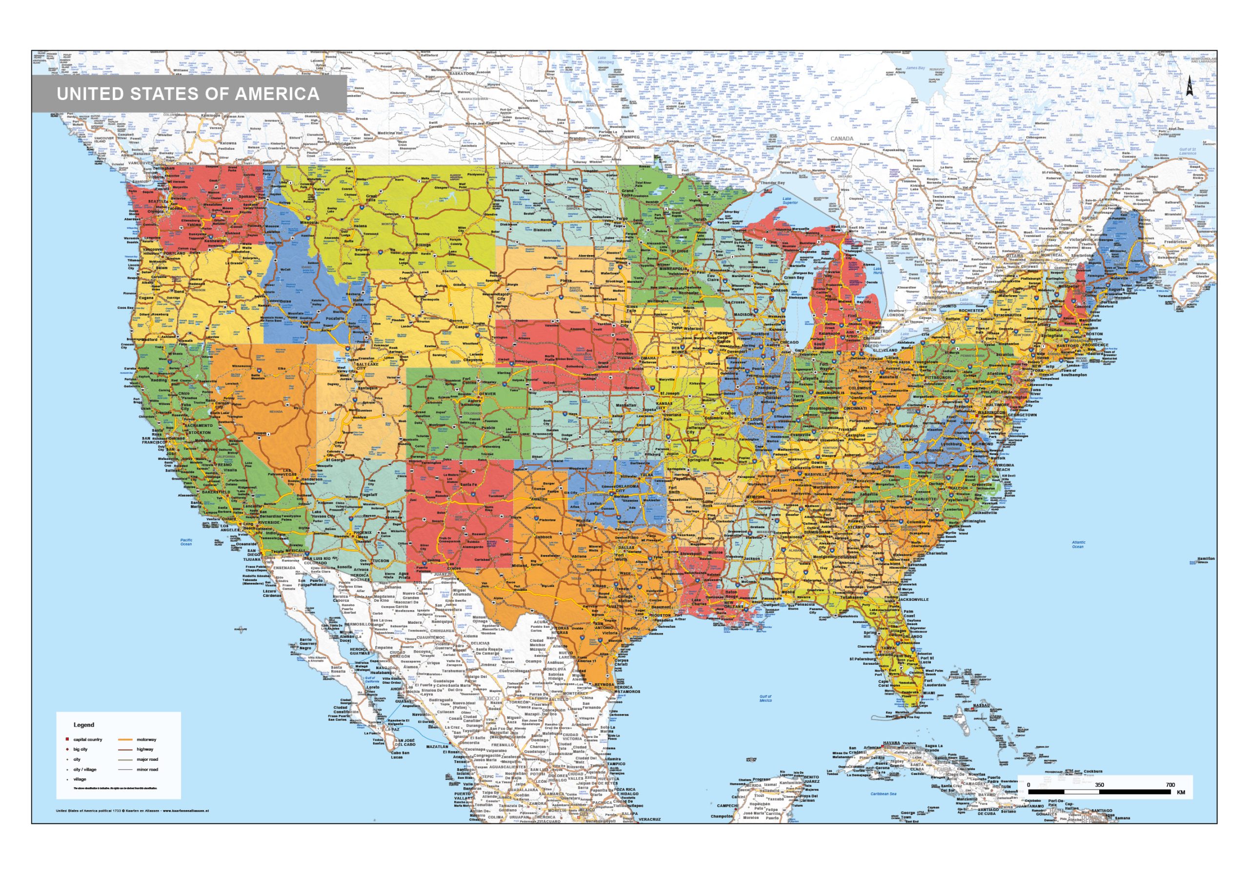 Een duidelijke staatkundige kaart van de Verenigde Staten waarop veel plaatsen en wegen met wegnummer zijn weergegeven. Alle staten hebben een eigen kleur waardoor de kaart een duidelijk overzicht geeft. De spoorlijnen zijn op deze kaart ook afgebeeld. Een mooie Engelstalige kaart van de United States of America. De kaart is ook in een natuurkundige uitvoering te bestellen.