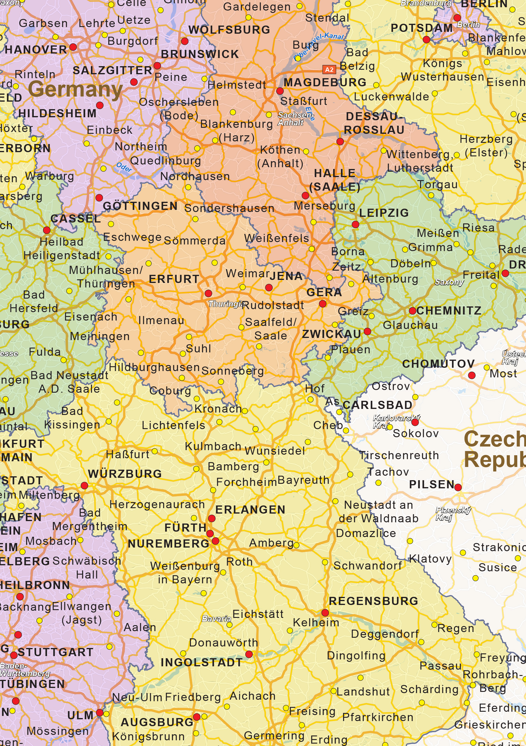 Een duidelijke landkaart van Duitsland op A3 formaat waarop de belangrijke plaatsen en wegen worden weergegeven. De provincies worden in verschillende kleuren getoond op deze kaart.