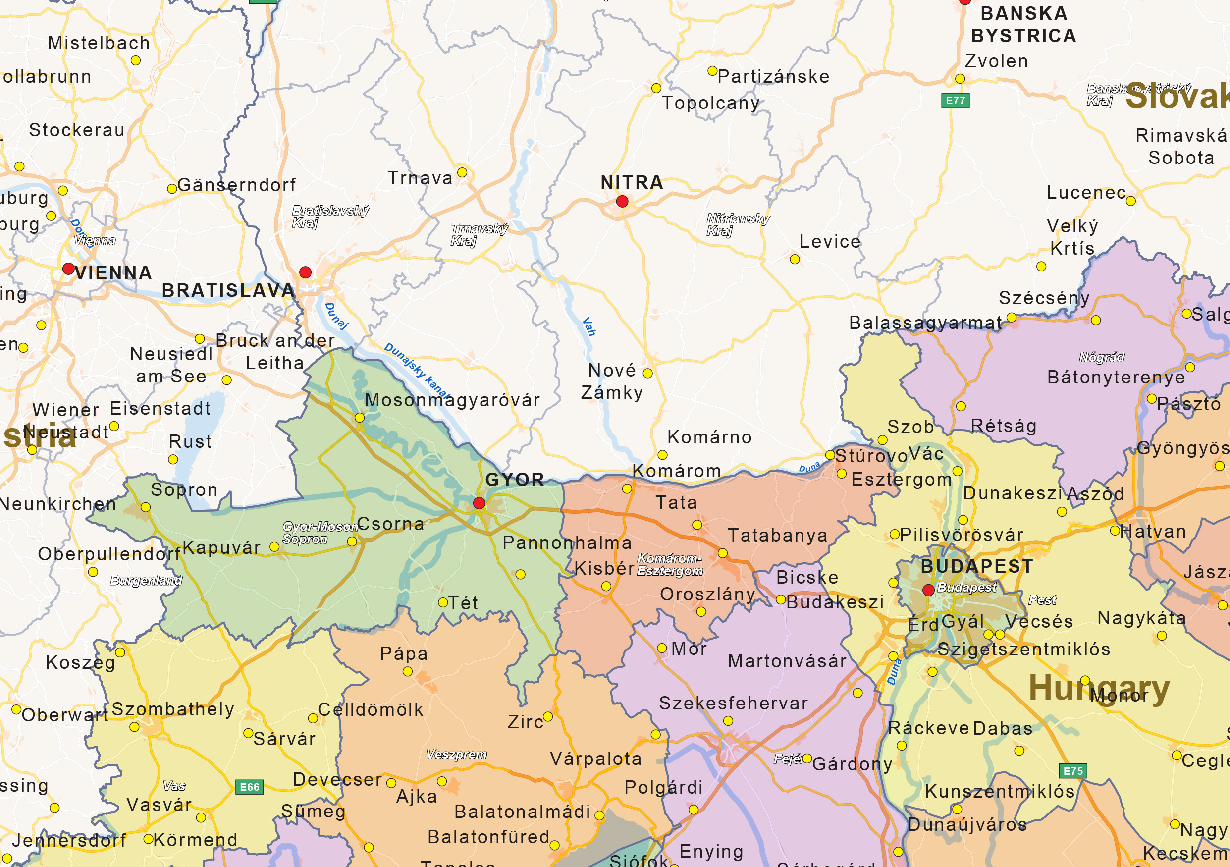 Een duidelijke landkaart van Hongarije waarop de belangrijke wegen worden weergegeven. De provincies worden in verschillende kleuren laten zien.