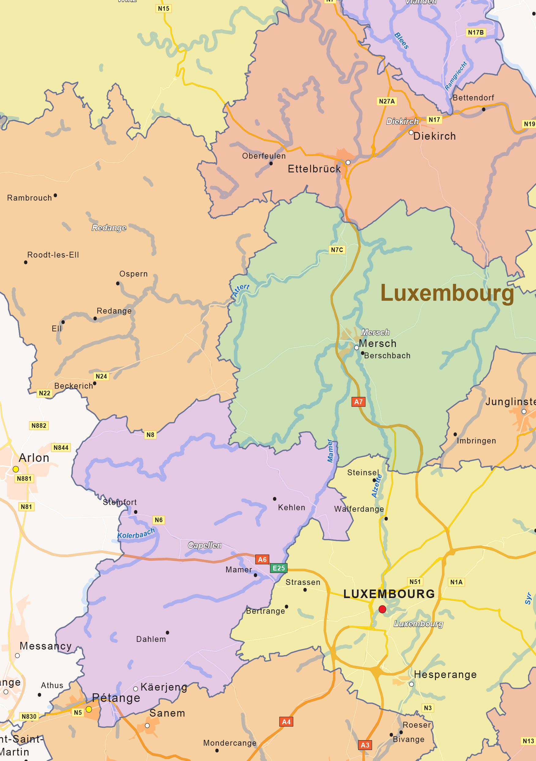 Een duidelijke landkaart van Luxemburg op A3 formaat waarop de belangrijke wegen en wateren worden weergegeven. De provincies worden in verschillende kleuren laten zien.