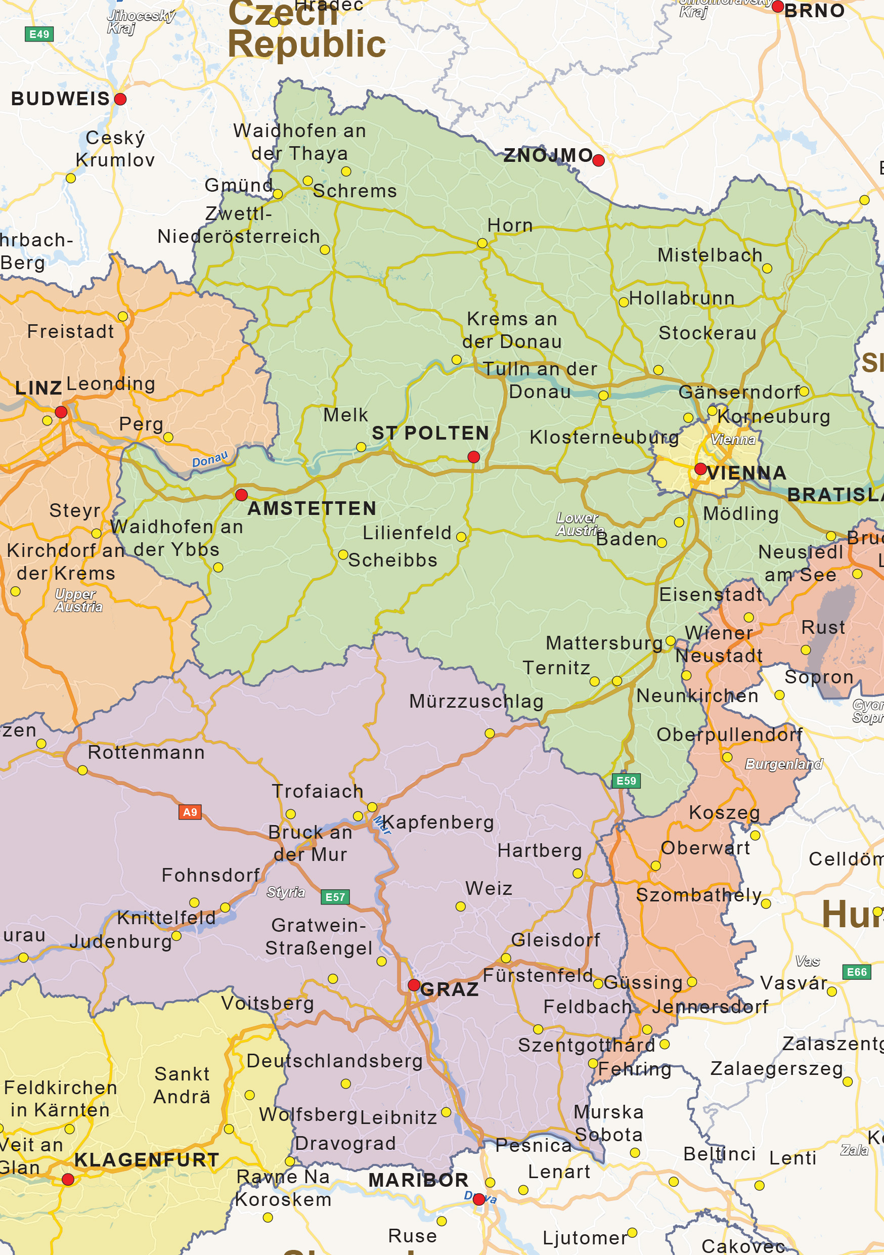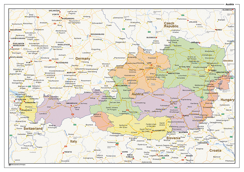 Een duidelijke landkaart van Oostenrijk waarop de belangrijke wegen worden weergegeven. De provincies worden in verschillende kleuren weergegeven.