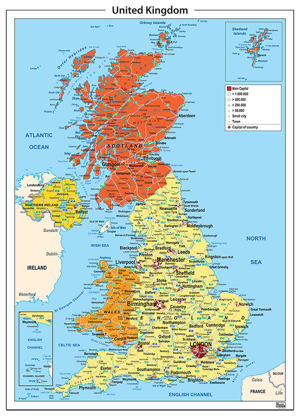 De staatkundige kaart van het Verenigd Koninkrijk/United Kingdom bevat onder andere de snelwegen, meest prominente plaatsen, wateren, plaatsnamen en waternamen. Met legenda.