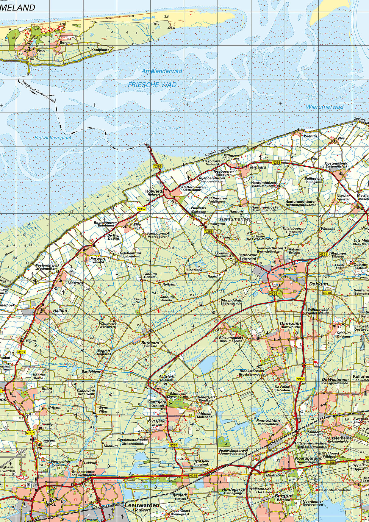 Gedetailleerde kaart van de Waddenzee met eilanden. Alle plaatsen, buurtschappen, wegen, wateren, spoorlijnen en bosgebieden zijn afgebeeld.