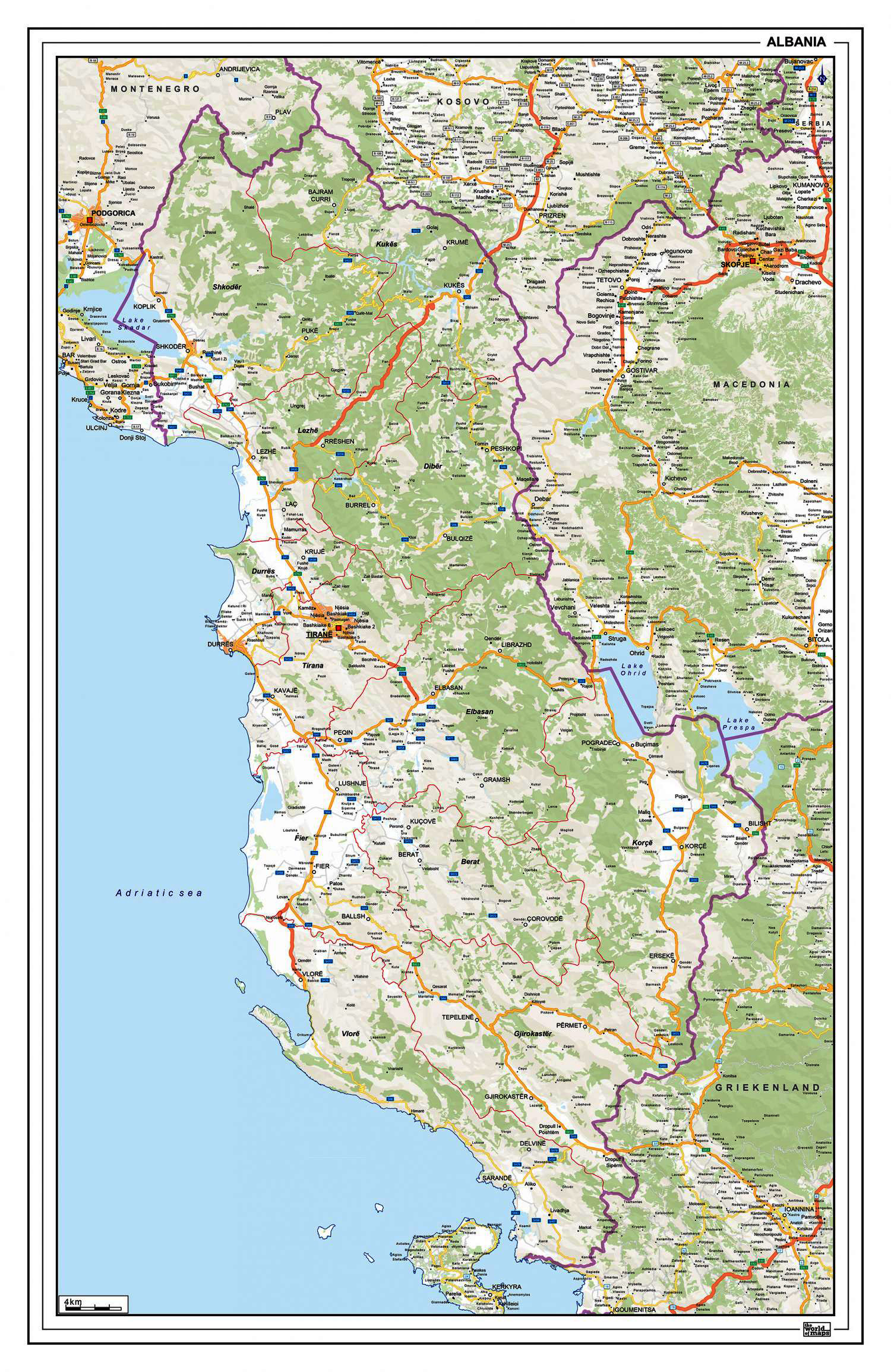 Een duidelijke wegenkaart van Albanie waarop alle wegnummers worden weergegeven.