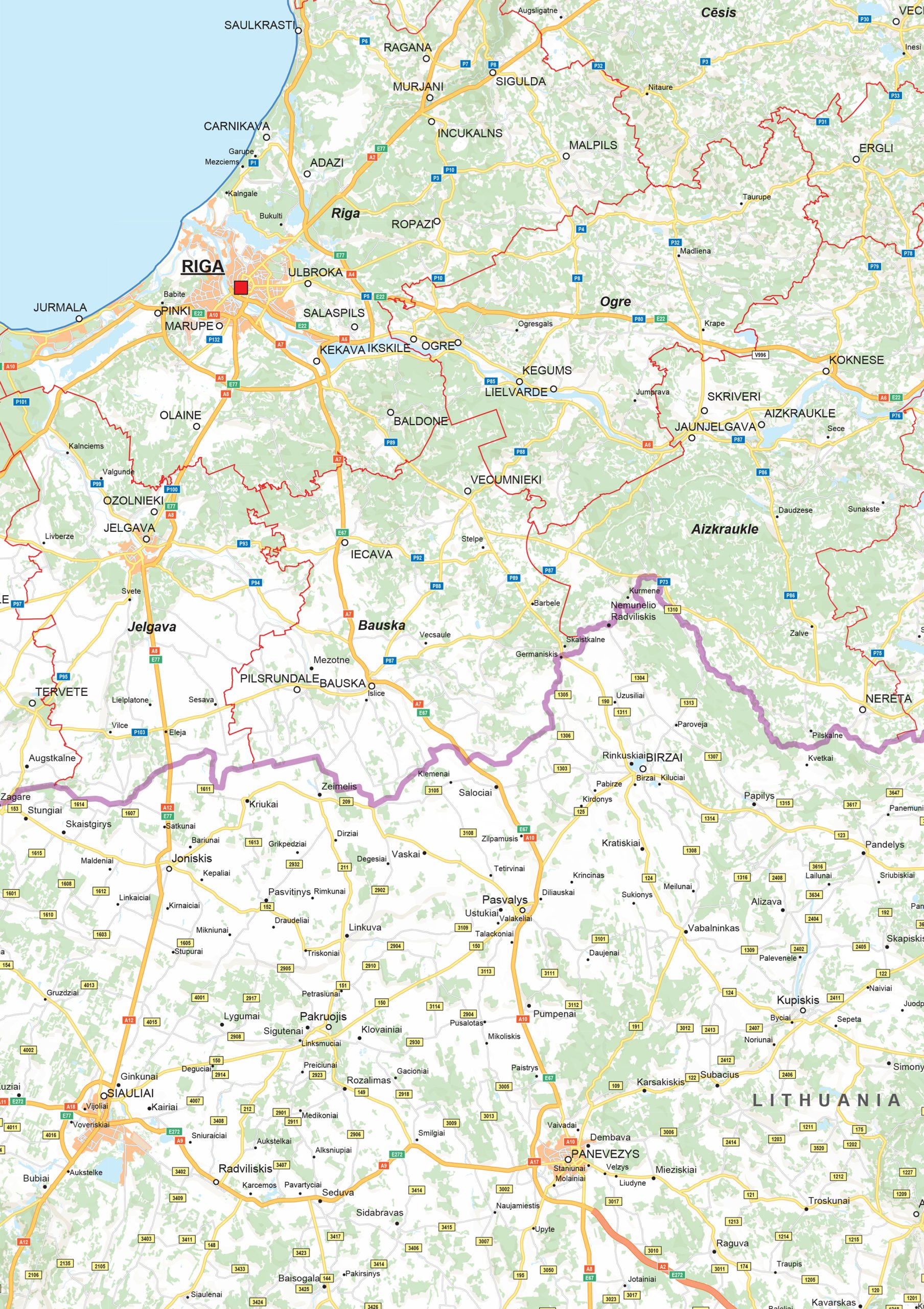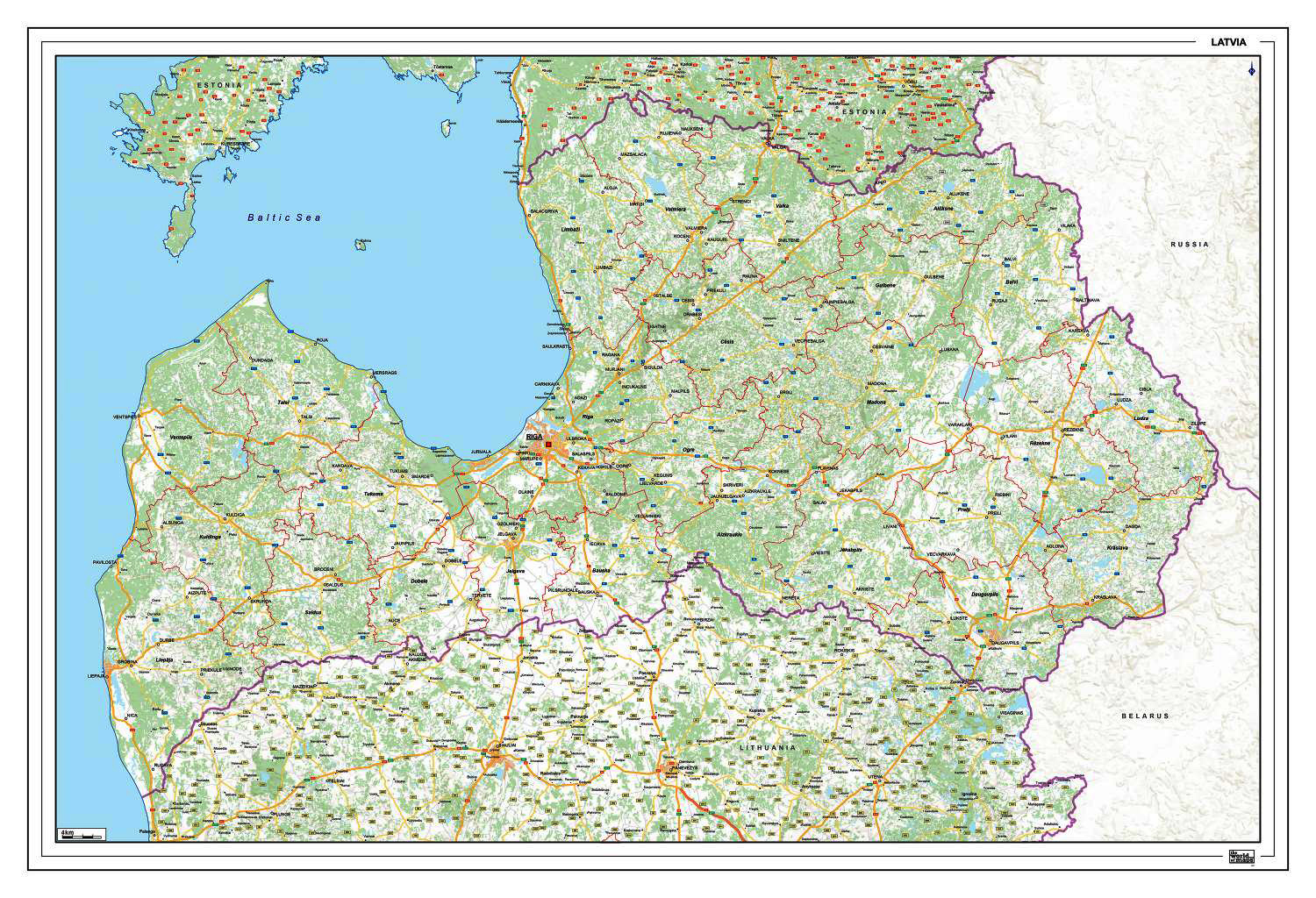 Een duidelijke wegenkaart van Letland waarop alle wegnummers worden weergegeven.