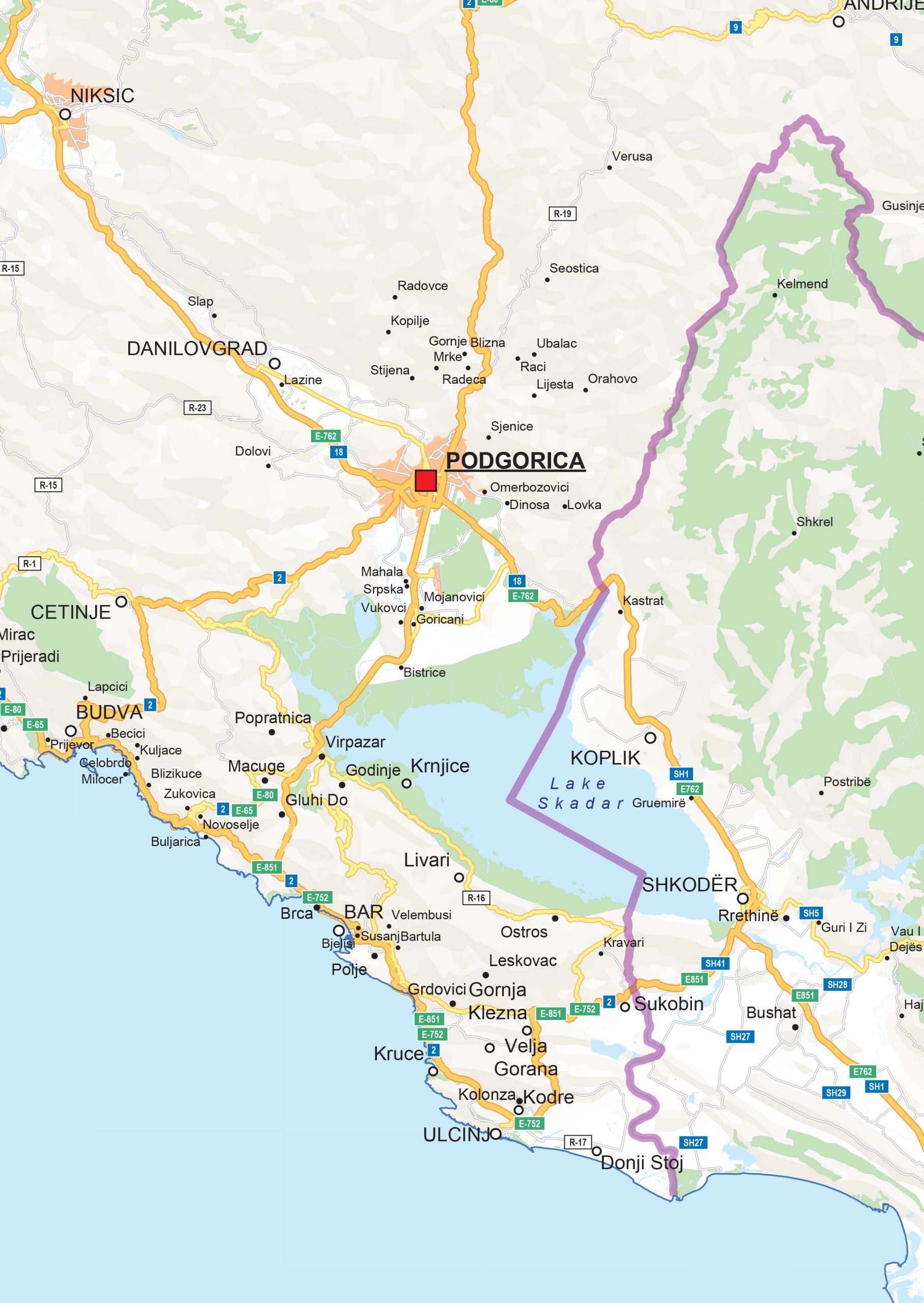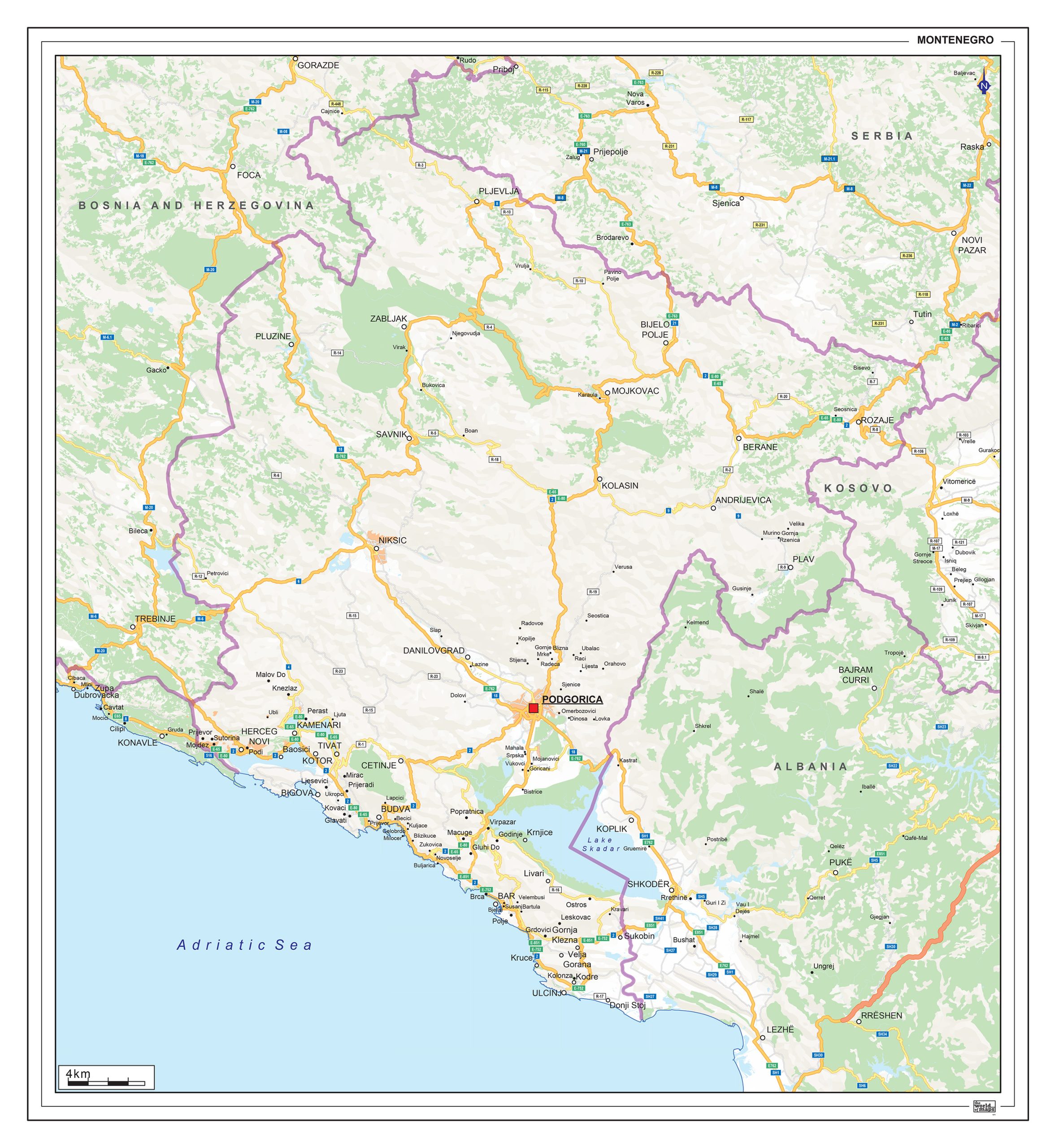 Een duidelijke wegenkaart van Montenegro waarop alle wegnummers worden weergegeven.