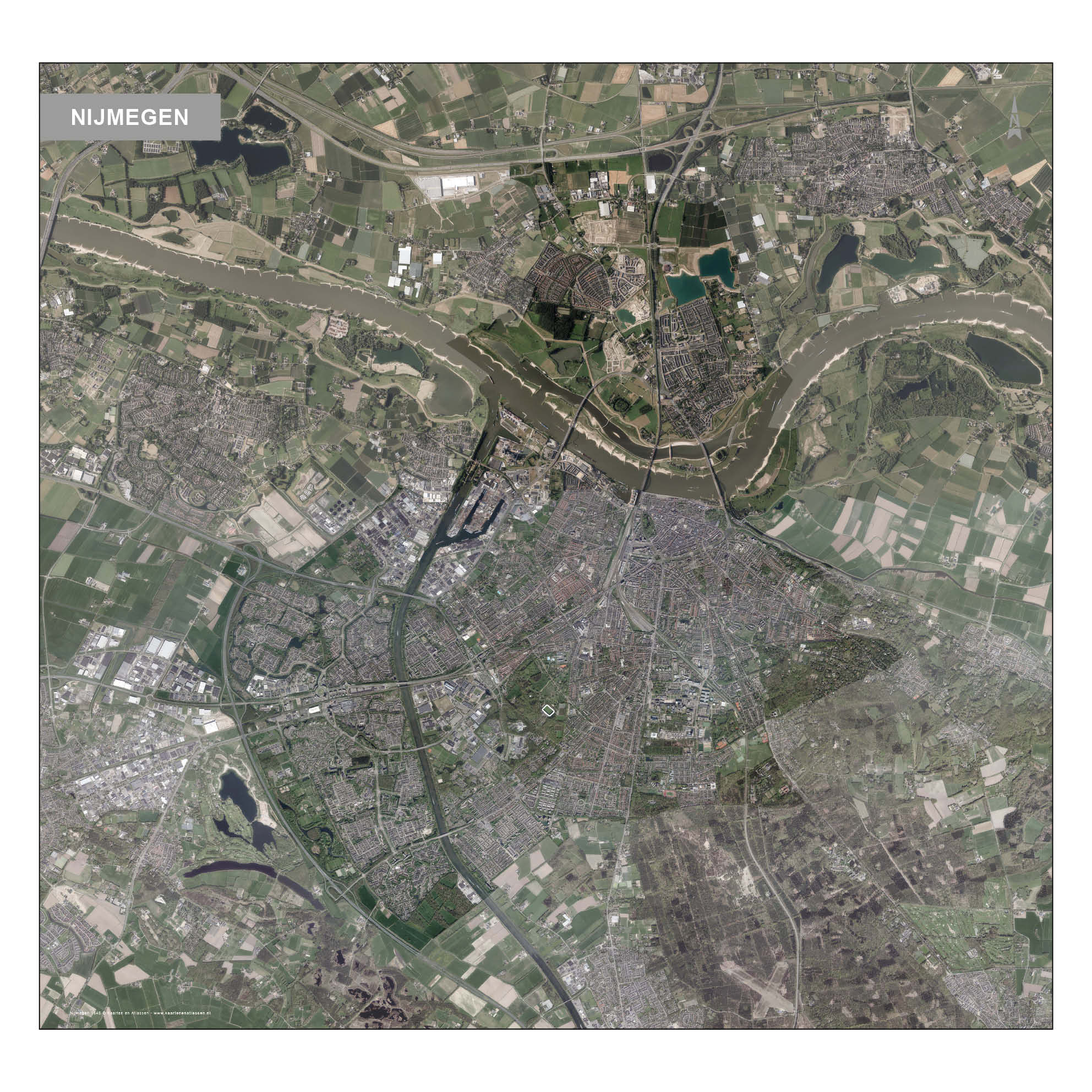 Haarscherpe luchtfotokaart van Nijmegen in natuurlijke kleuren. De hele gemeente Nijmegen is uitgelicht zodat de grenzen duidelijk zichtbaar zijn. De kaart is in veel verschillende uitvoeringen leverbaar. Andere gebieden in binnen- en buitenland zijn op aanvraag ook leverbaar. De foto is naadloos samengesteld uit kleinere deelfoto’s. Geheel Nederland is vorig jaar op deze manier gefotografeerd. Het is ook mogelijk om locaties in de kaart te zetten of deze te verrijken met carografische data. Er zijn ook luchtfotokaarten van Amsterdam, Utrecht, Rotterdam en Den Haag te bestellen.