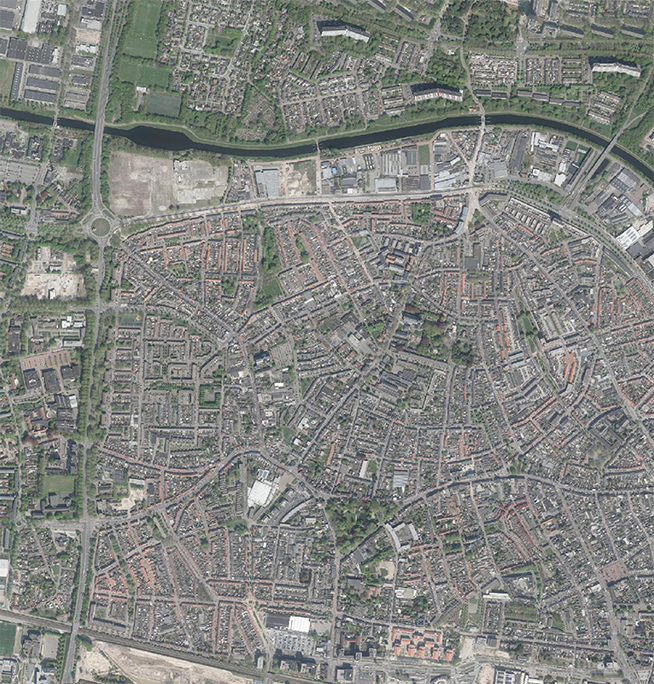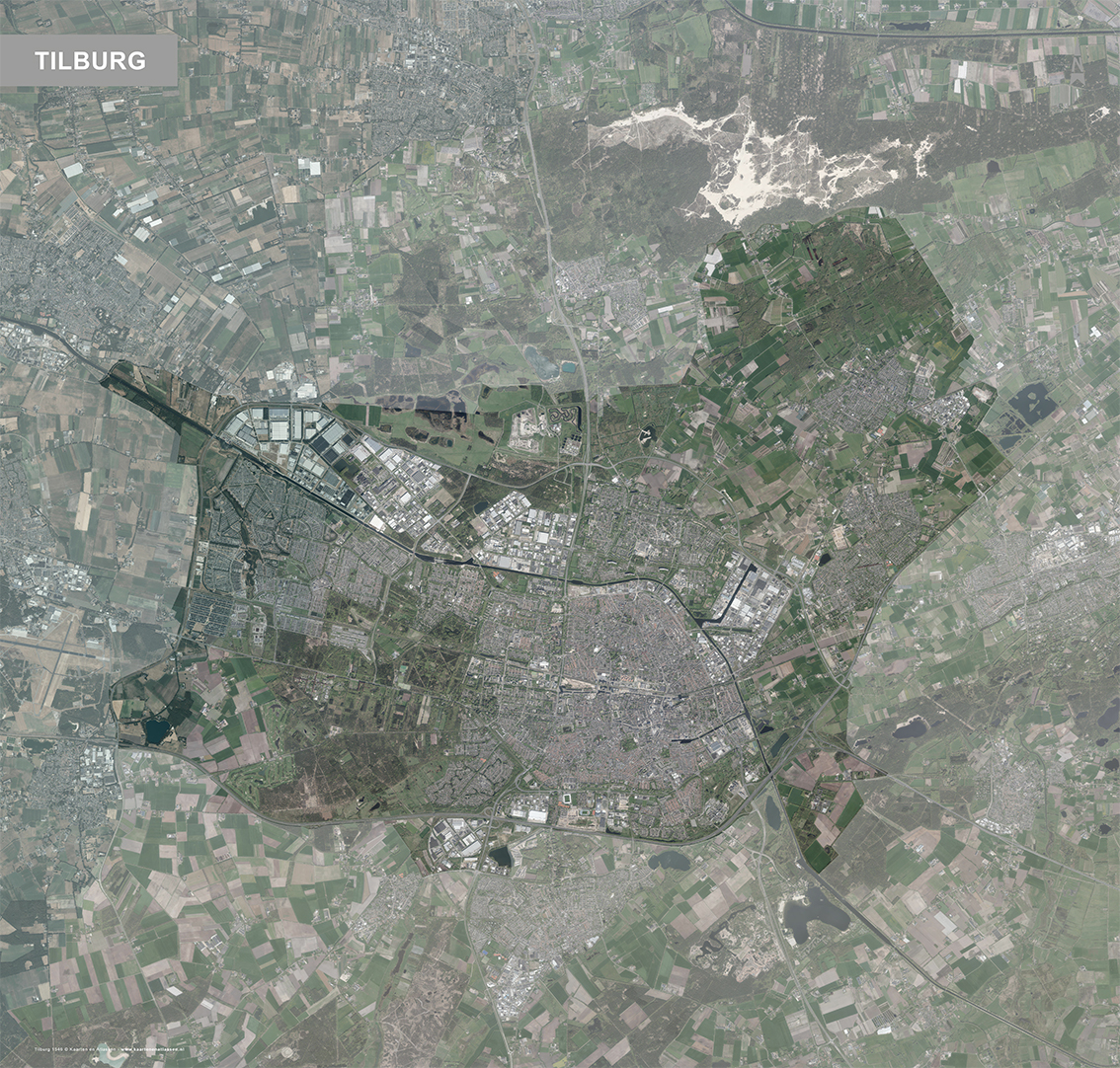 Haarscherpe luchtfotokaart van Tilburg in natuurlijke kleuren. De hele gemeente Tilburg is uitgelicht zodat de grenzen duidelijk zichtbaar zijn. De kaart is in veel verschillende uitvoeringen leverbaar. Andere gebieden in binnen- en buitenland zijn op aanvraag ook leverbaar. De foto is naadloos samengesteld uit kleinere deelfoto’s. Geheel Nederland is vorig jaar op deze manier gefotografeerd. Het is ook mogelijk om locaties in de kaart te zetten of deze te verrijken met carografische data. Er zijn ook luchtfotokaarten van Amsterdam, Utrecht, Rotterdam en Den Haag te bestellen.