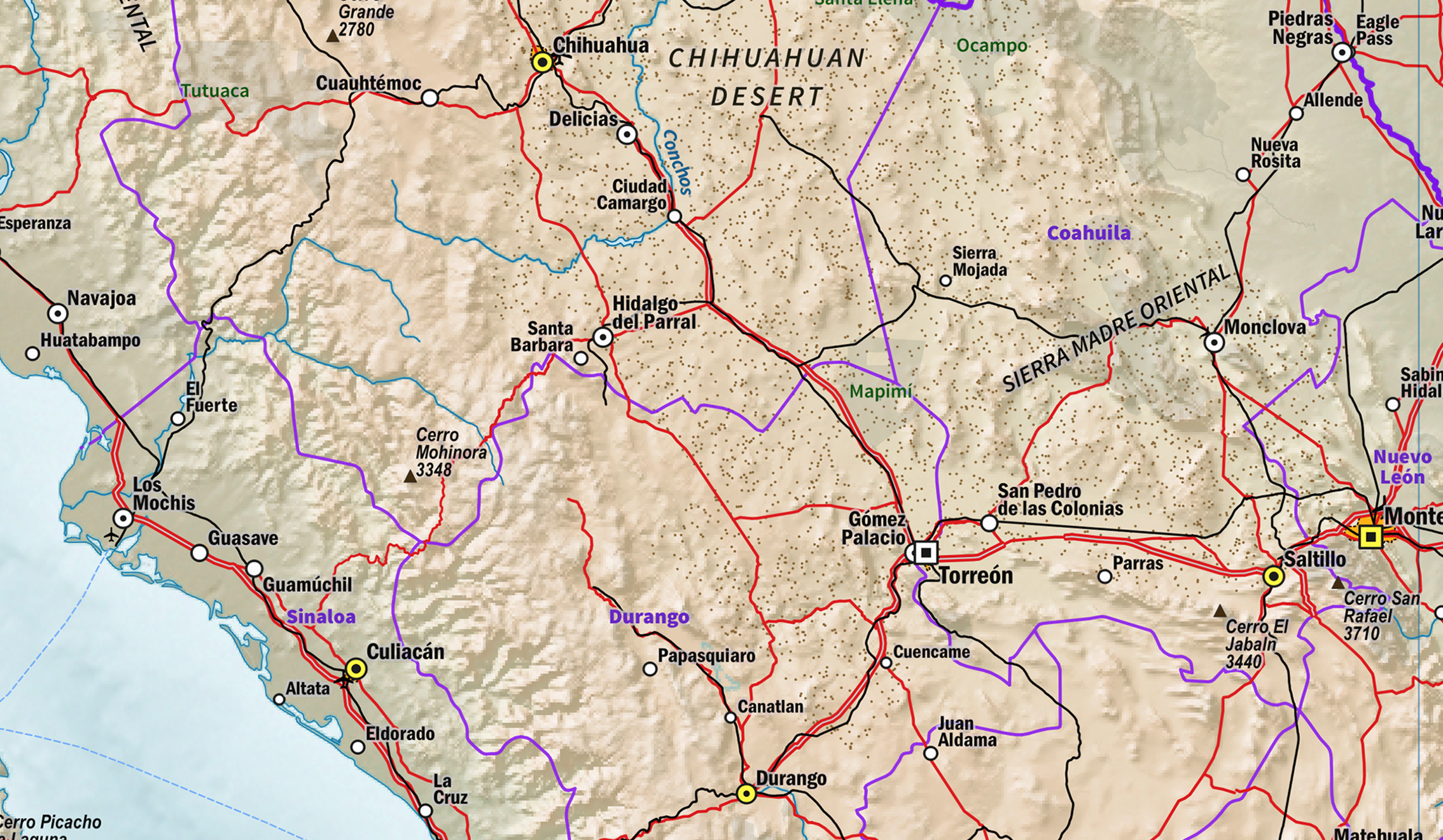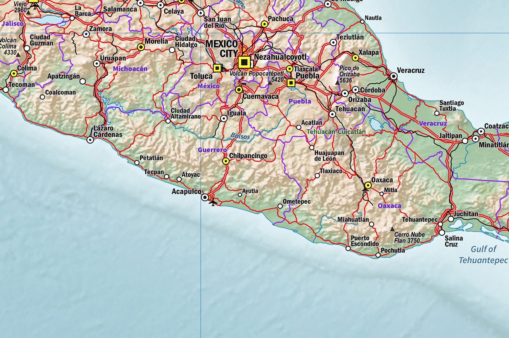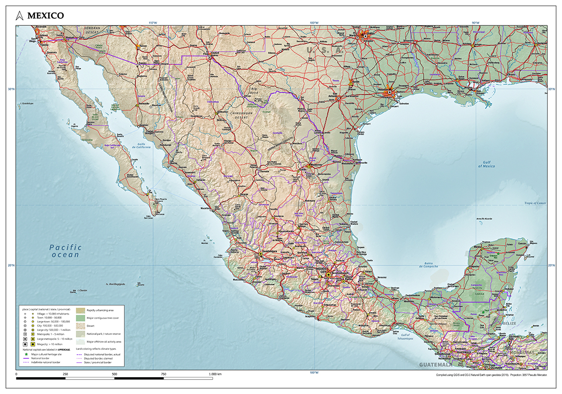 Gedetailleerde natuurkundige kaart van Mexico. De legenda met vooral de weergave van de steden is zeer gedetailleerd. De kleuren geven het grondgebruik weer. De kaart is samengesteld uit de Natural Earth open geodata. Met Engelse tekst.