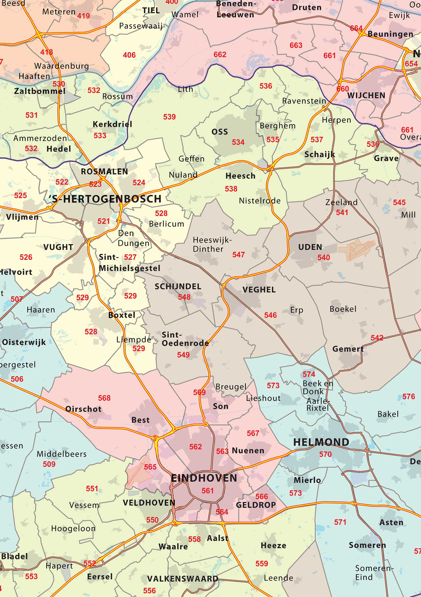 Postcodekaart van Nederland. Geeft naast de 3-cijferige postcodegebieden ook de 2-cijferige postcodegebieden in kleur weer. Met alle gemeentes en hoofdwegennet.