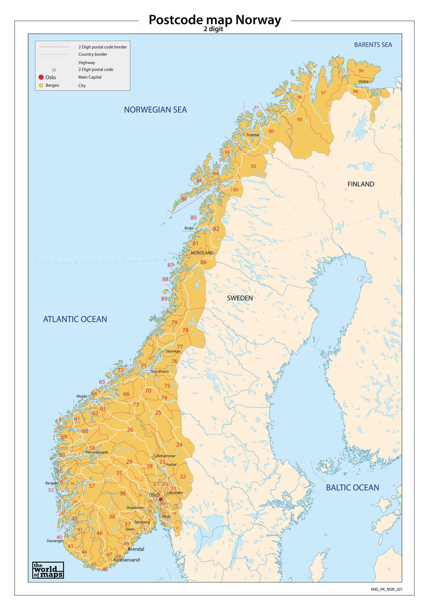 Overzichtelijke 2-cijferige postcodekaart van Noorwegen. Engelstalig. Met duidelijk legendaoverzicht.