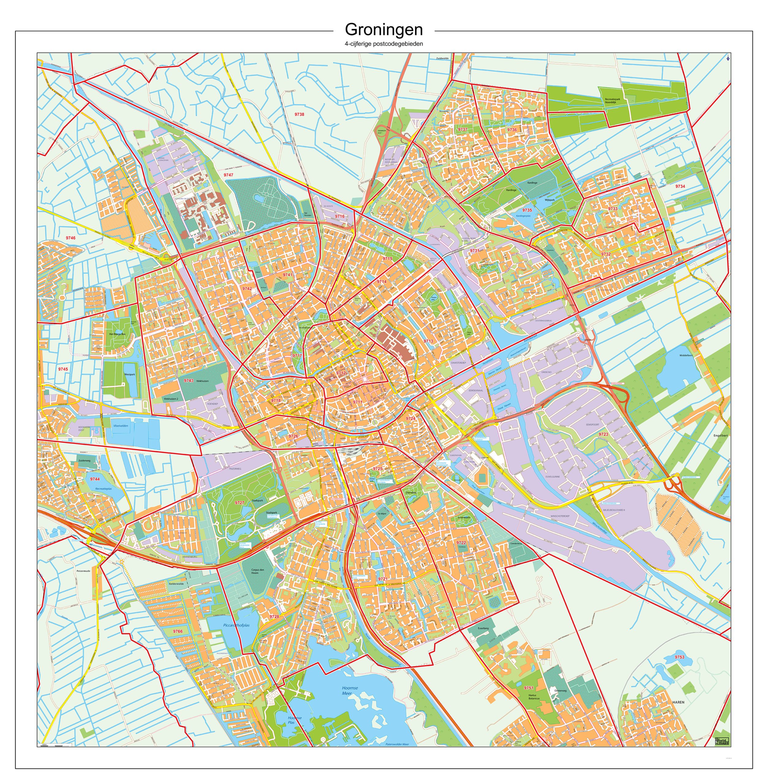 Zeer duidelijke 4-cijferige postcodekaart van Groningen. De kaart is zowel informatief als decoratief. Alle postcodegebieden en bijna alle straatnamen staan op de kaart. Bekijk ook eens onze andere steden postcodekaarten.