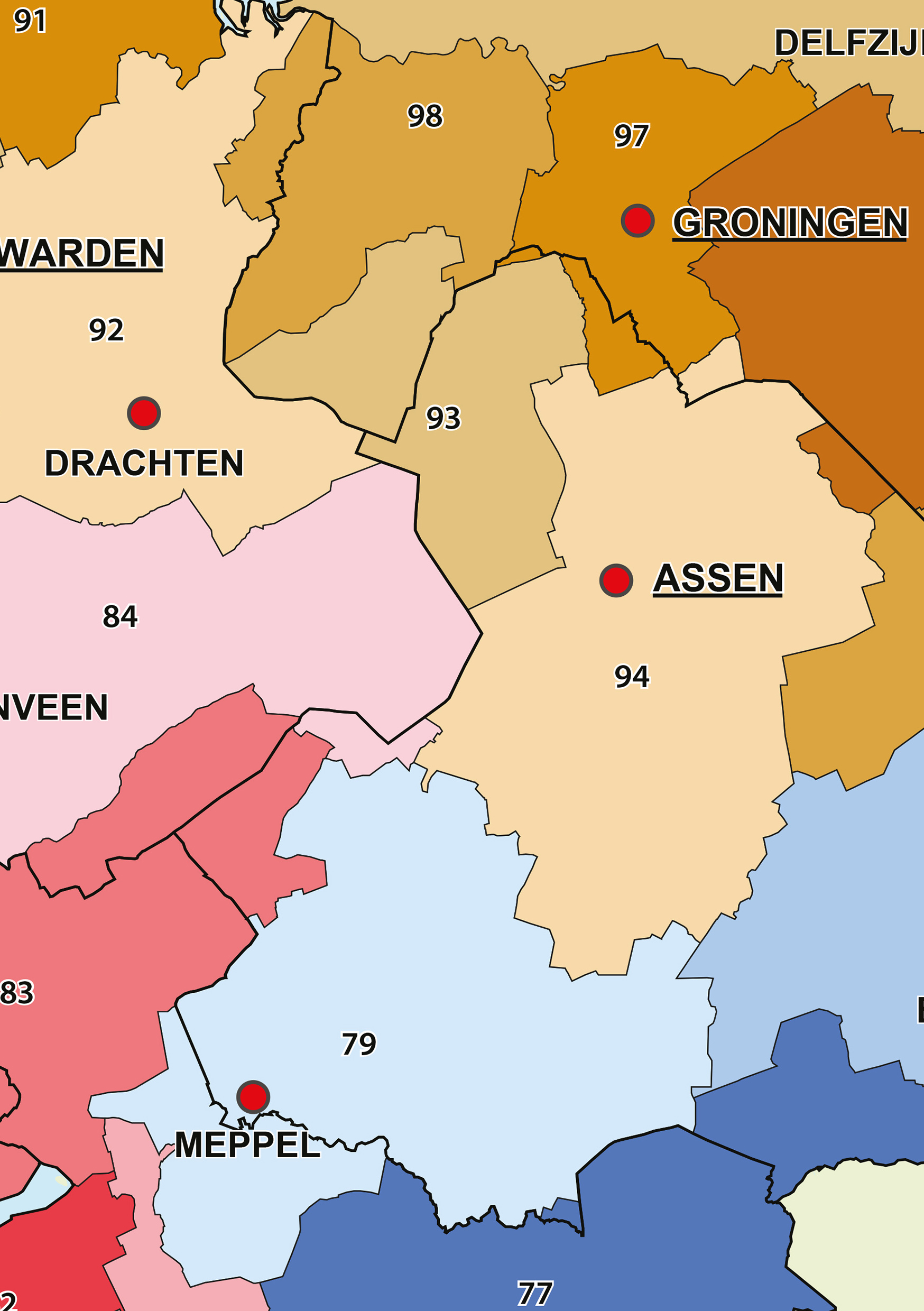 Geeft naast de 2-cijferige postcodegebieden ook de 1-cijferige postcodegebieden in kleur weer. Alle postcodegebieden worden in een lijst weergegeven.