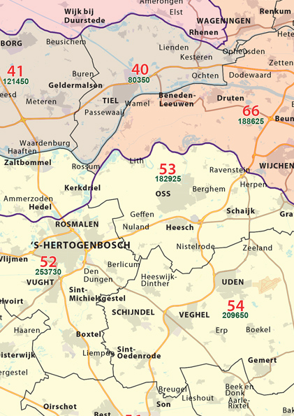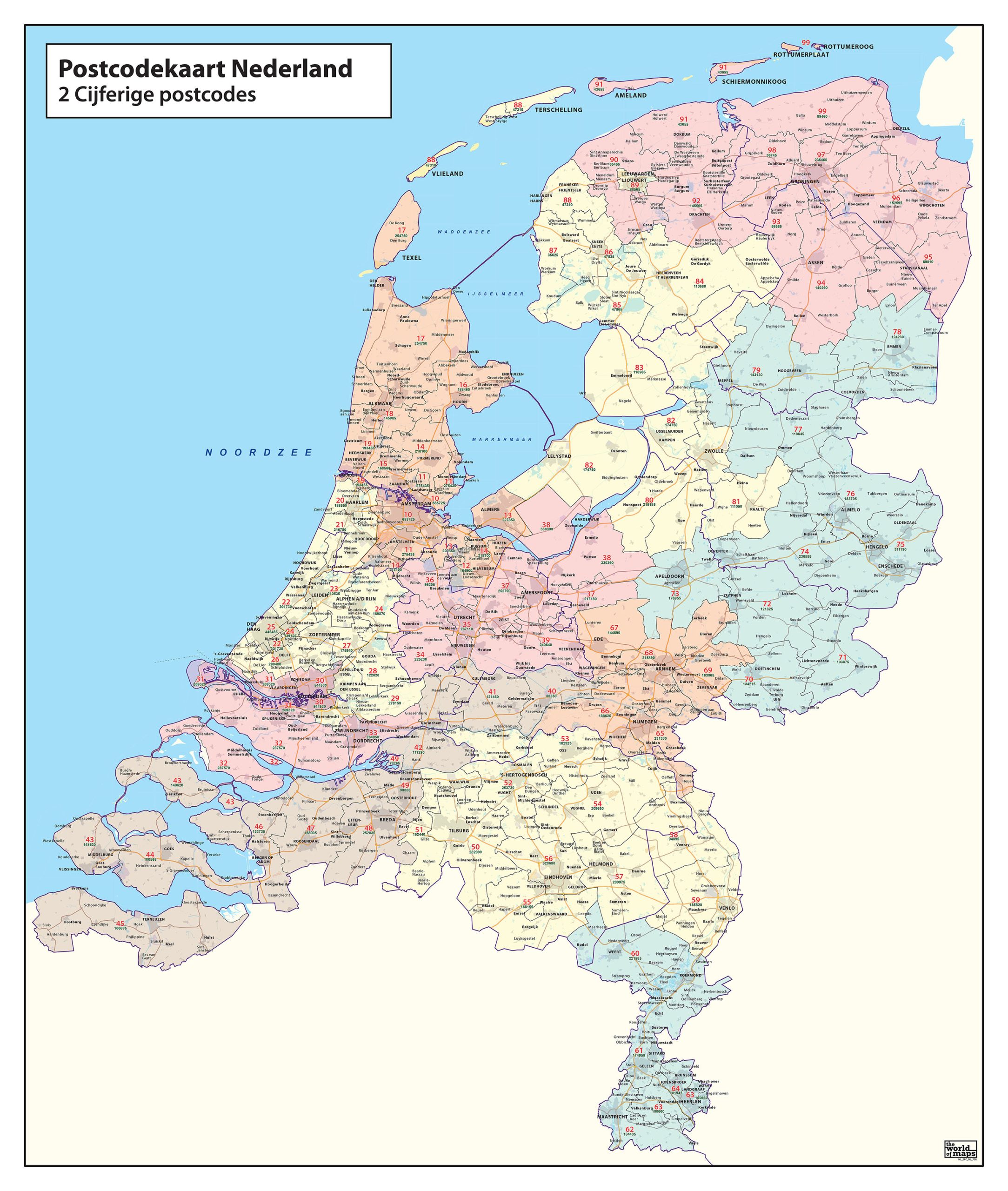 Postcodekaart van Nederland. Geeft naast de 2-cijferige postcodegebieden ook de 1-cijferige postcodegebieden in kleur weer. Ook zijn de inwoners aantallen weergegeven.