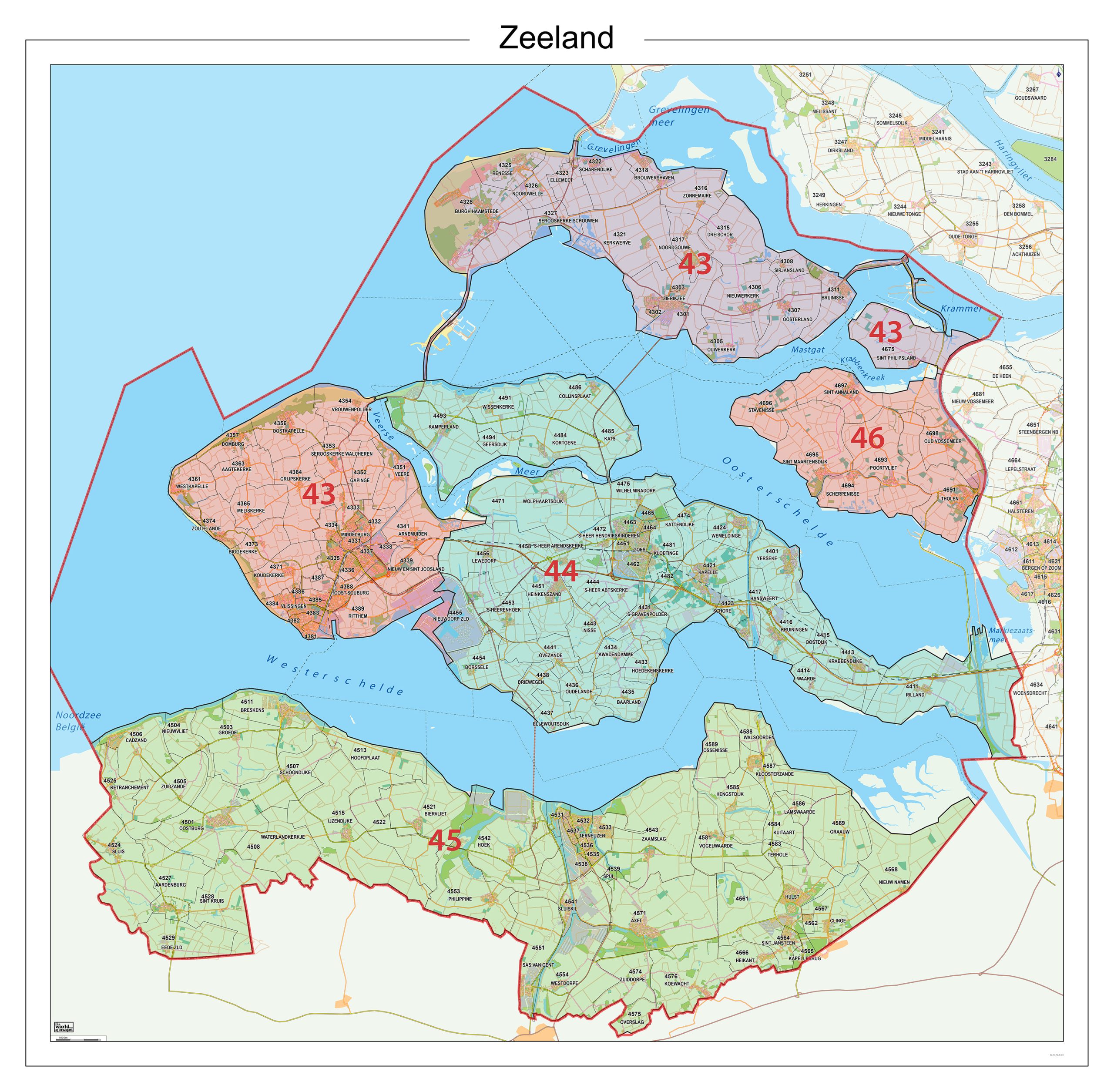 Zeer duidelijke 2-cijferige en 4-cijferige provincie-postcodekaart.