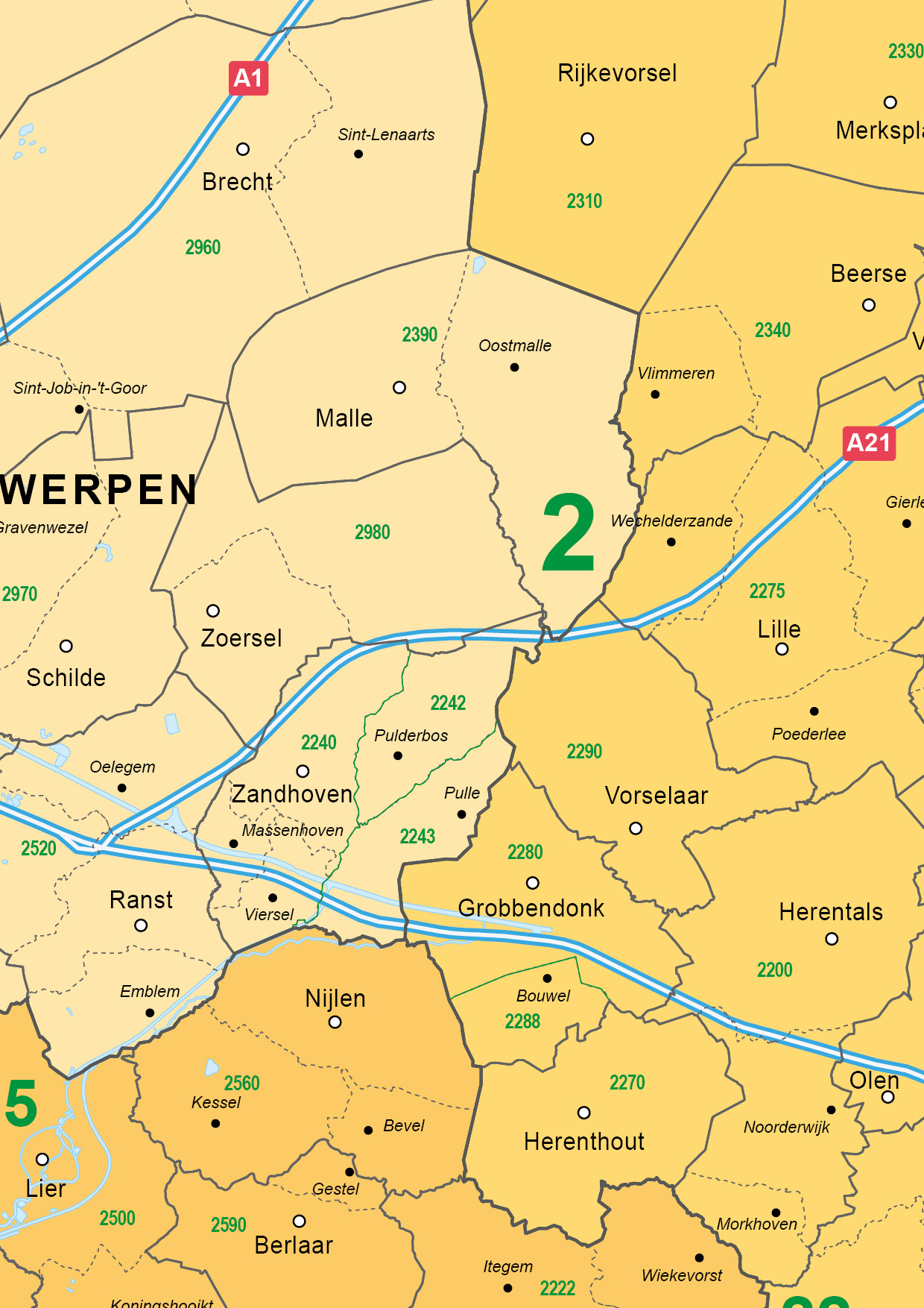 Zeer duidelijke en overzichtelijke administratieve kaart van de provincie Antwerpen. Alle gemeenten en 4-cijferige postcodes zijn overzichtelijk weergegeven met grens en naam. Voor het overzicht zijn ook de 2-cijferige nummers afgebeeld. Door het kleurgebuik onderscheiden alle 2-cijferige postcodegebieden zich ook van elkaar. Daarnaast zijn alle snelwegen met wegnummers afgebeeld. Van de andere Vlaamse provincies zijn ook administratieve kaarten gemaakt.