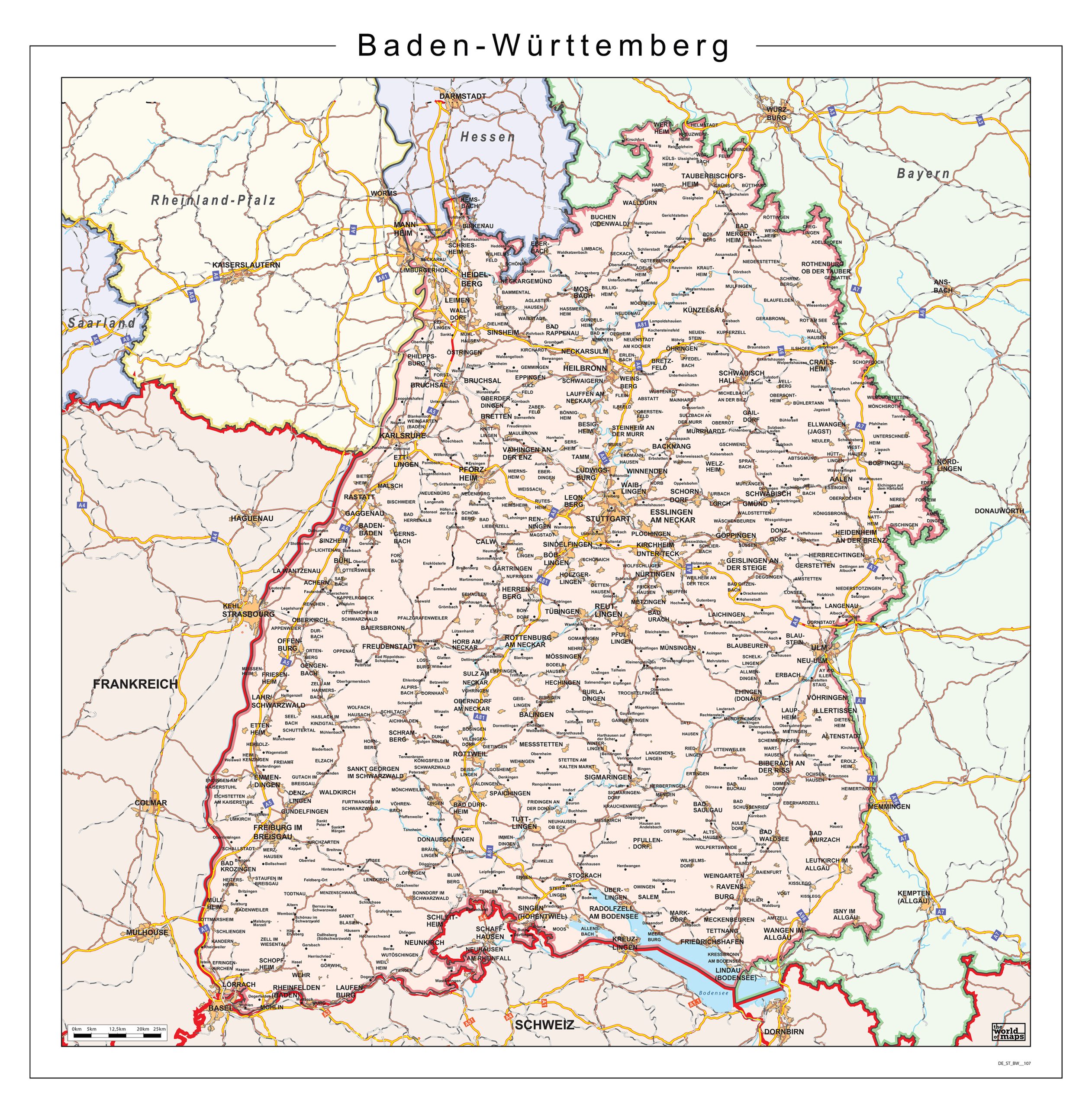 Staatkundige kaart van de Deelstaat Baden-Württemberg in prachtige pasteltinten.