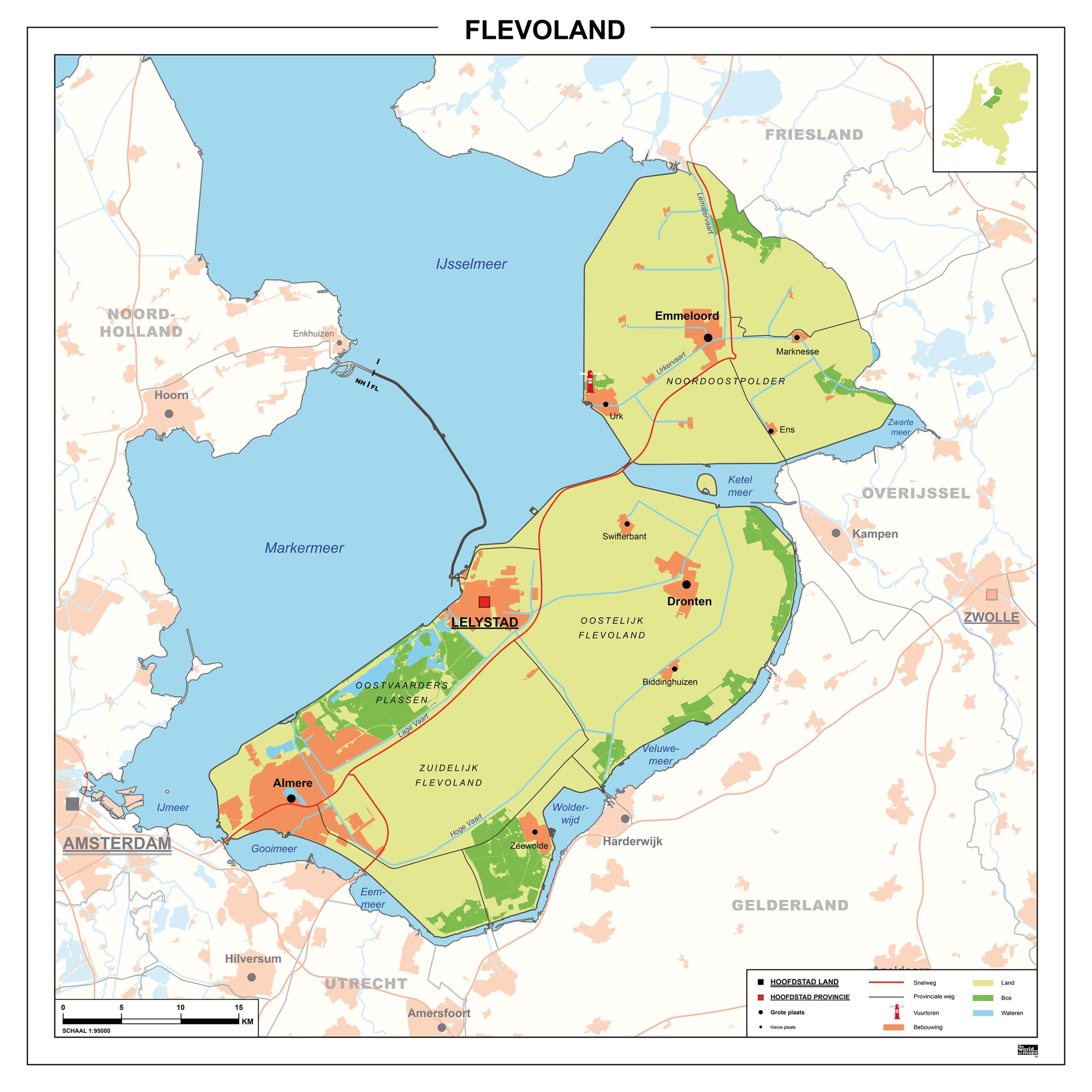 Duidelijke provinciekaart van Flevoland waarop grotere plaatsen, wegen en wateren zijn afgebeeld. De plaatsen, wateren en streken zijn afgeleid uit de diverse topo online methoden. De kaart bevat dus alle relevante informatie die de leerlingen moeten weten. Ook alle andere provincies van deze serie zijn leverbaar.