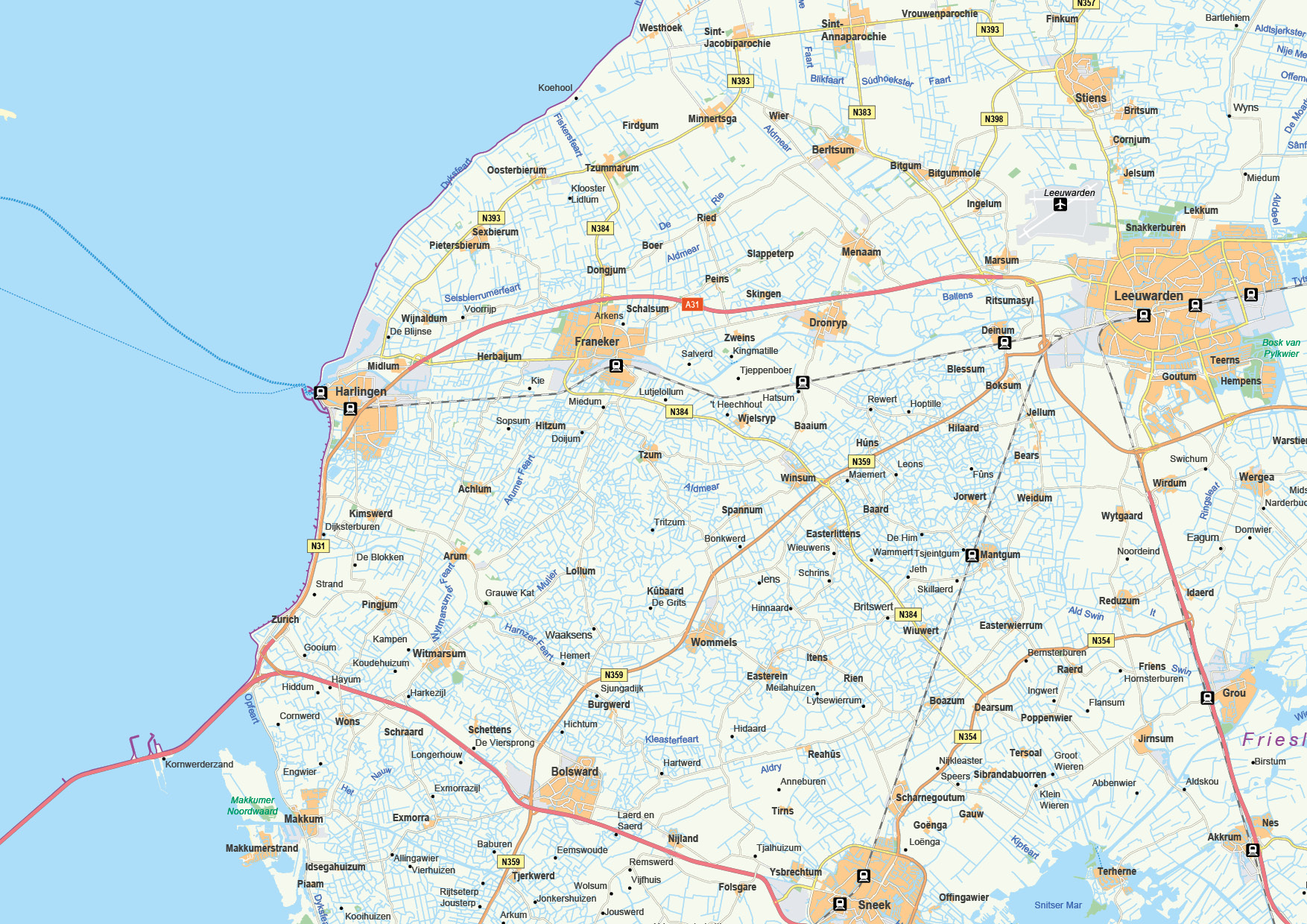 Gedetailleerde kaart van de provincie Friesland incl. de Friese eilanden. Wegen, buurtschappen, wateren en spoorlijnen en alle plaatsen zijn afgebeeld. Ook het is op deze kaart het grondgebruik weergeven. Met een duidelijke legenda. Ook leverbaar als topografische kaart Friesland 1484.
