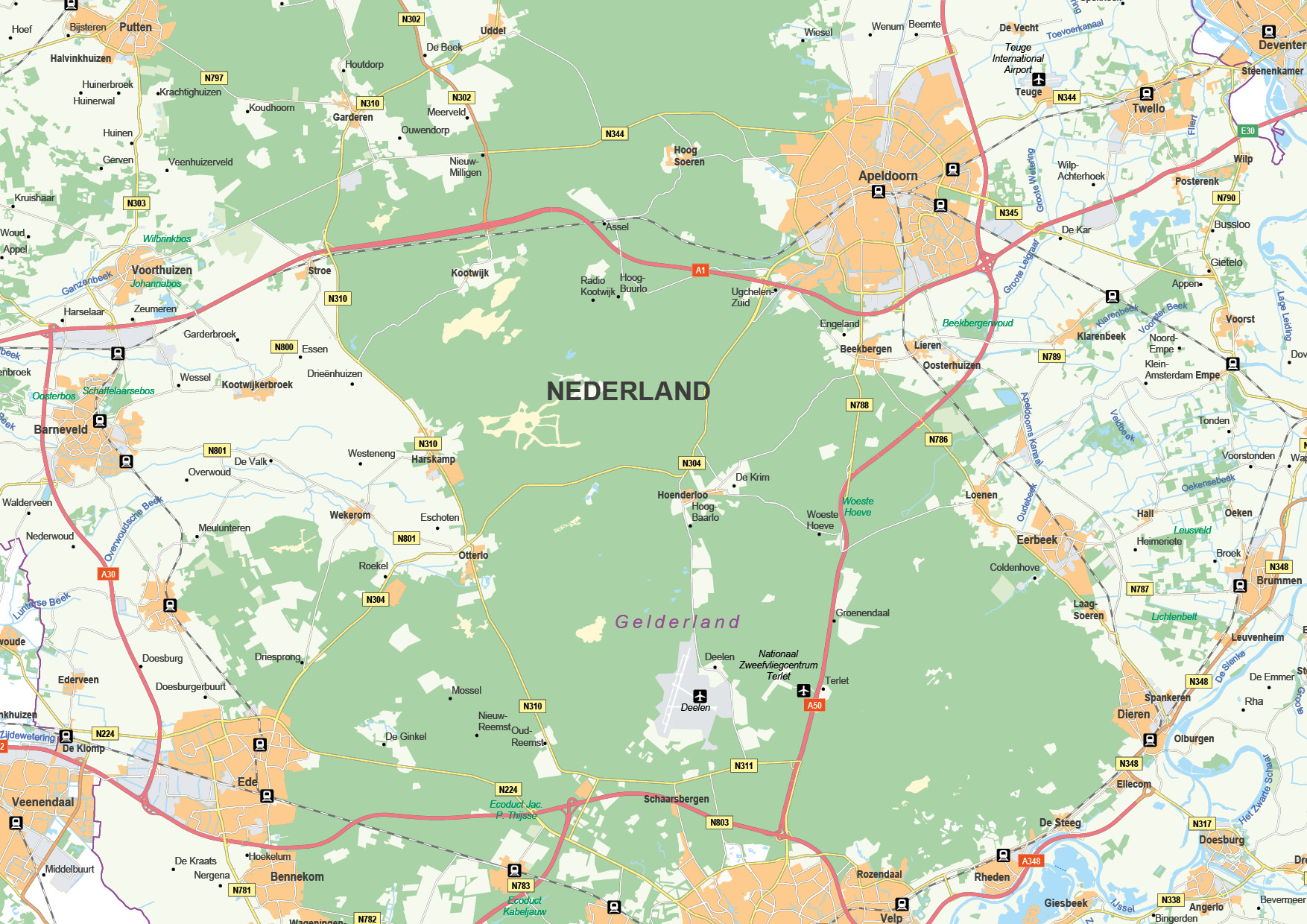 Kaart van Gelderland waarop alle plaatsen, buurtschappen,  wegen, wateren en spoorlijnen gedetailleerd zijn afgebeeld. Het grondgebruik is ook aangegeven. Met duidelijke legenda. Ook leverbaar als topografische kaart Gelderland 1482.