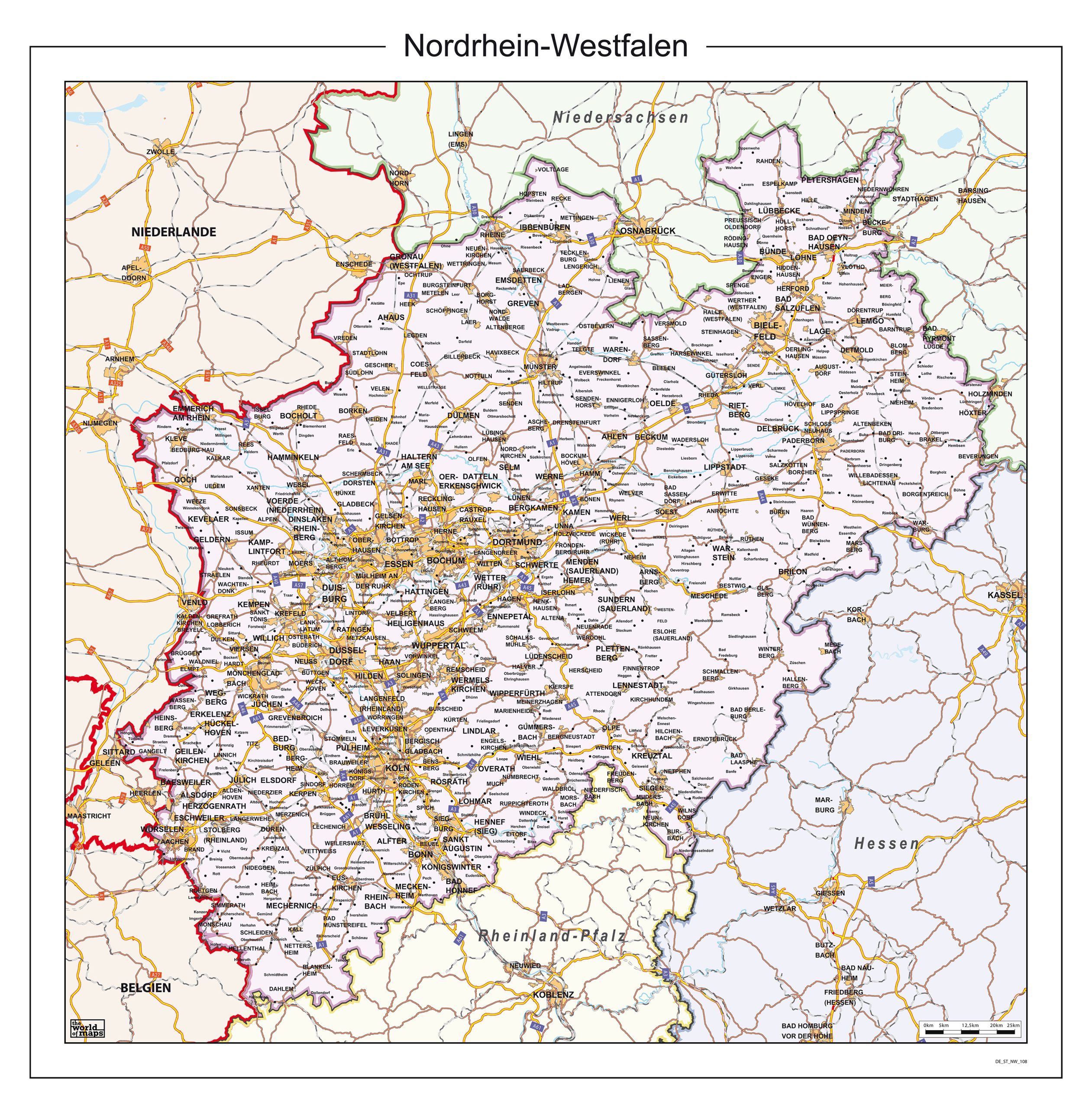 Staatkundige kaart van de Deelstaat Nordrhein-Westfalen in prachtige pasteltinten.