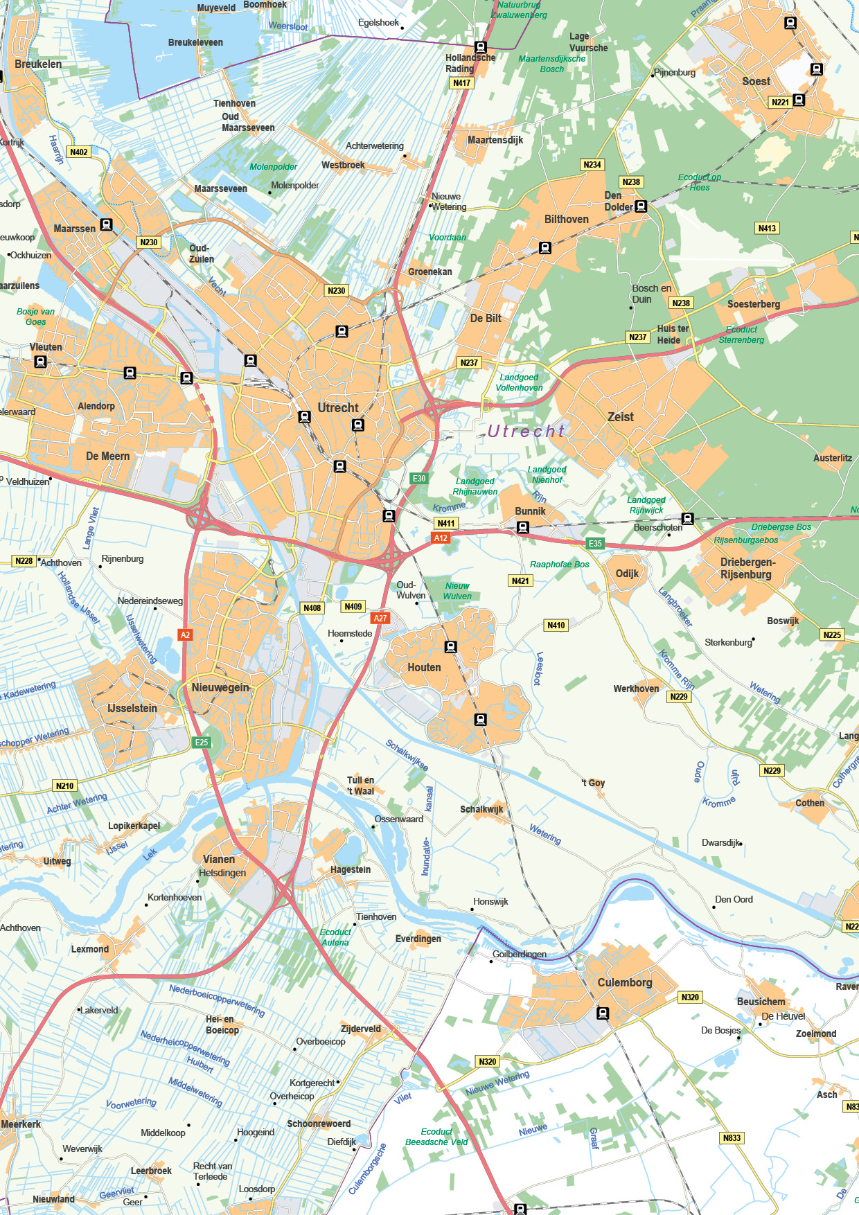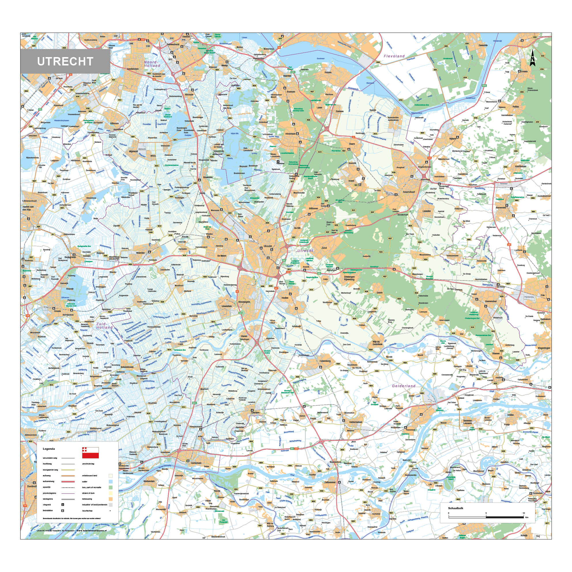 Utrecht afgebeeld als provinciekaart waarop alle plaatsen, buurtschappen,  wegen, wateren en spoorlijnen zijn afgebeeld en waarop ook het grondgebruik is aangegeven. Met duidelijke legenda. Ook leverbaar als topografische kaart Utrecht.
