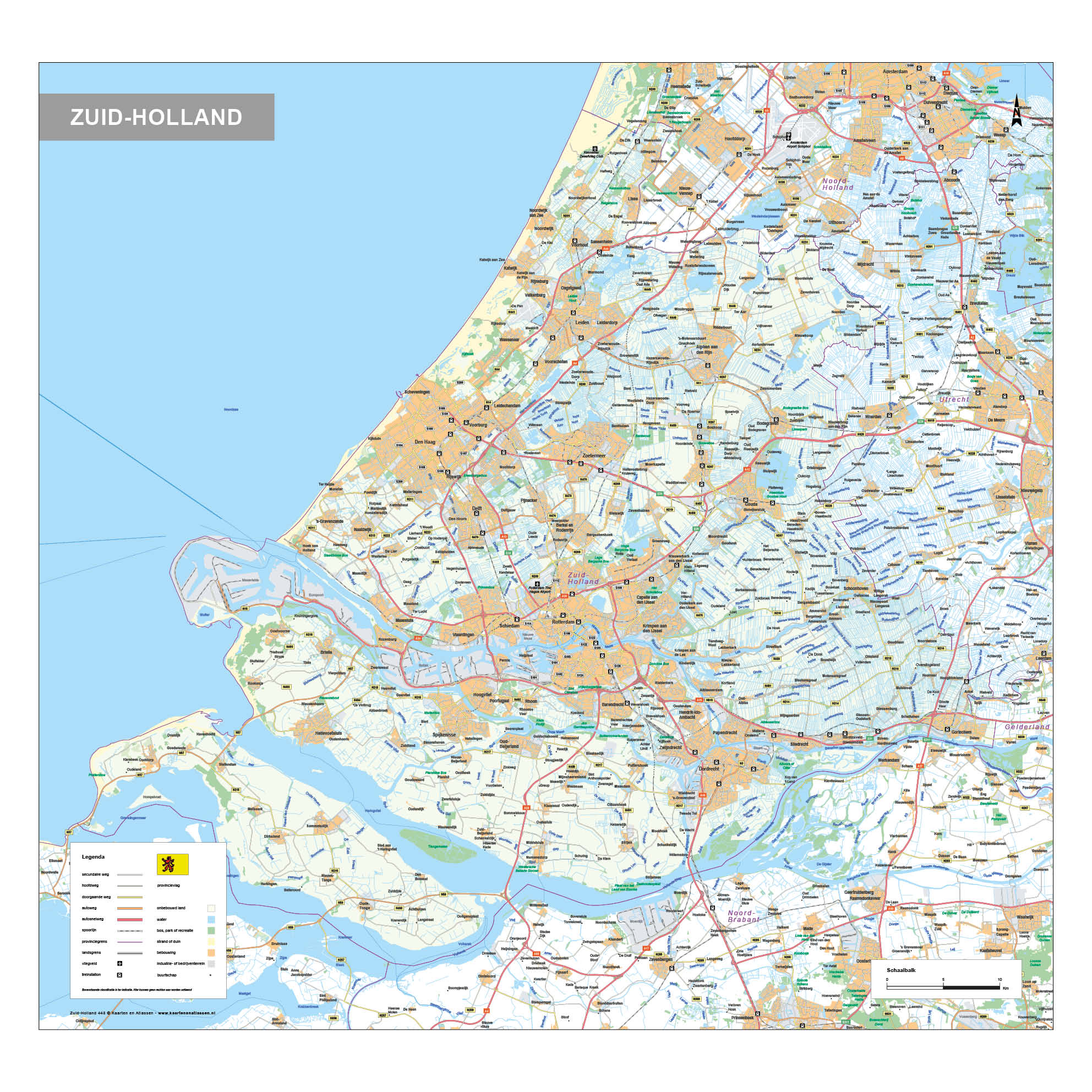 Gedetailleerde provinciekaart waarop alle plaatsen, buurtschappen, wegen, wateren en spoorlijnen van Zuid-Holland zijn afgebeeld. Op deze poster is ook het grondgebruik weergeven. Met duidelijke legenda. Ook leverbaar als topografische kaart Zuid-Holland.