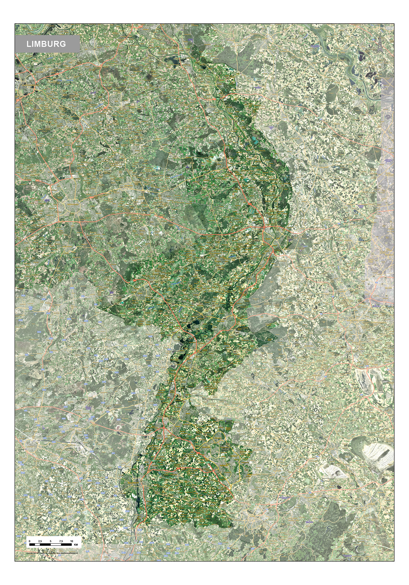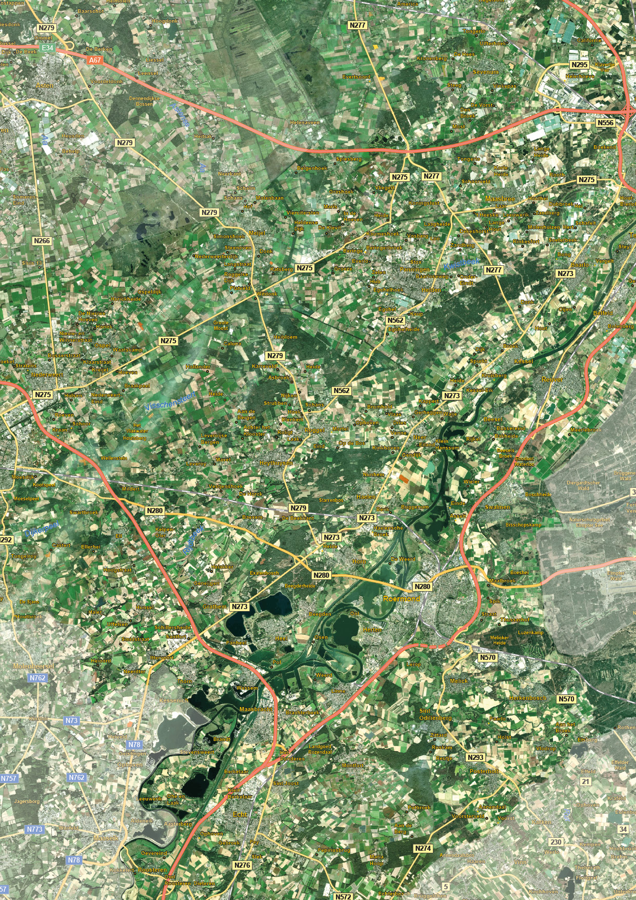 Gedetailleerde satellietkaart van Limburg. De ondergrond is het satellietbeeld, de topping bestaat uit extra informatie zoals plaatsnamen en wegen. Vooral de landstructuur is duidelijk weergegeven.