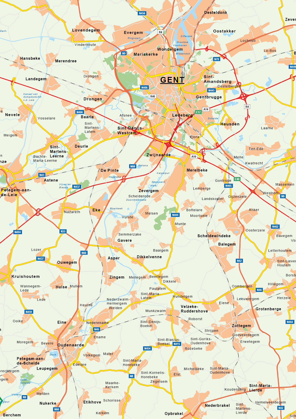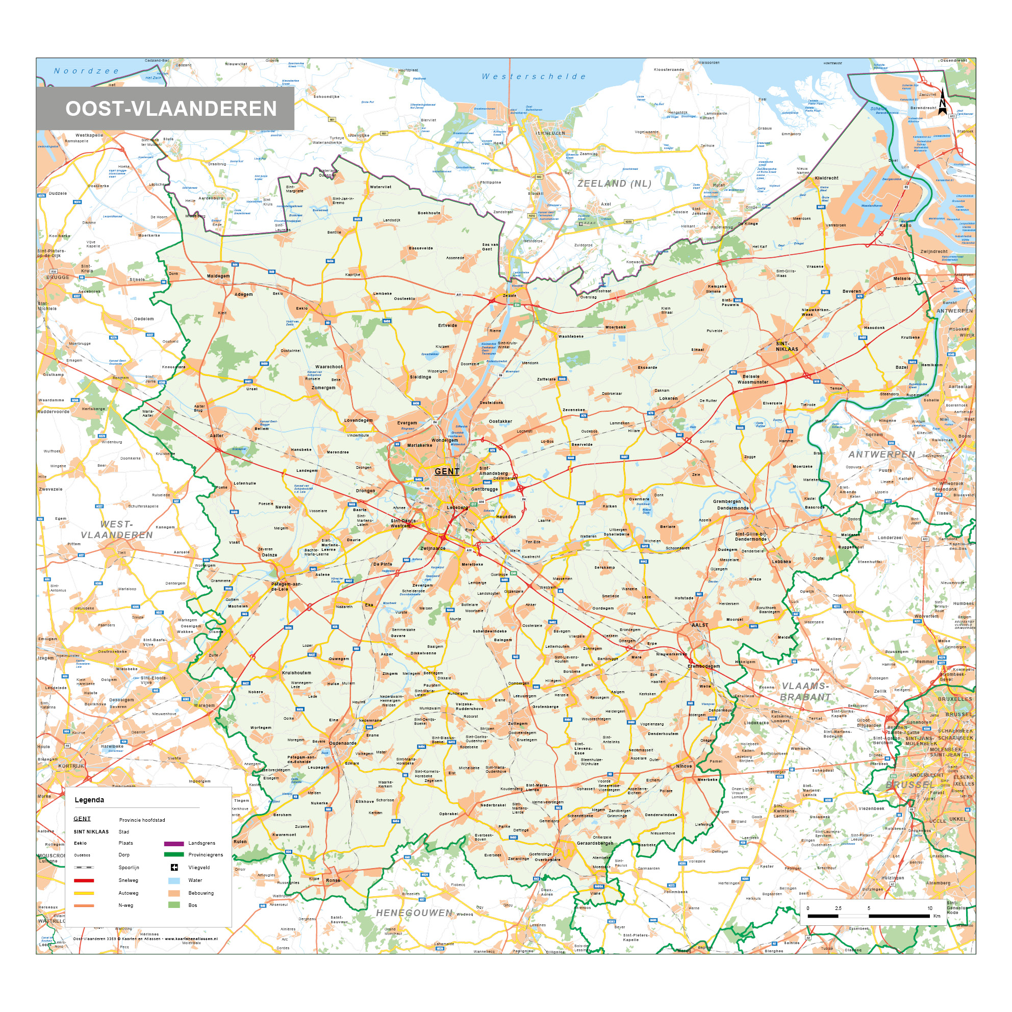 Deze kaart bevat naast de provinciegrenzen en grotere steden veel kleinere plaatsen, wegen en wateren van de provincie Oost-Vlaanderen. De kaart geeft ook mooi het grondgebruik weer.