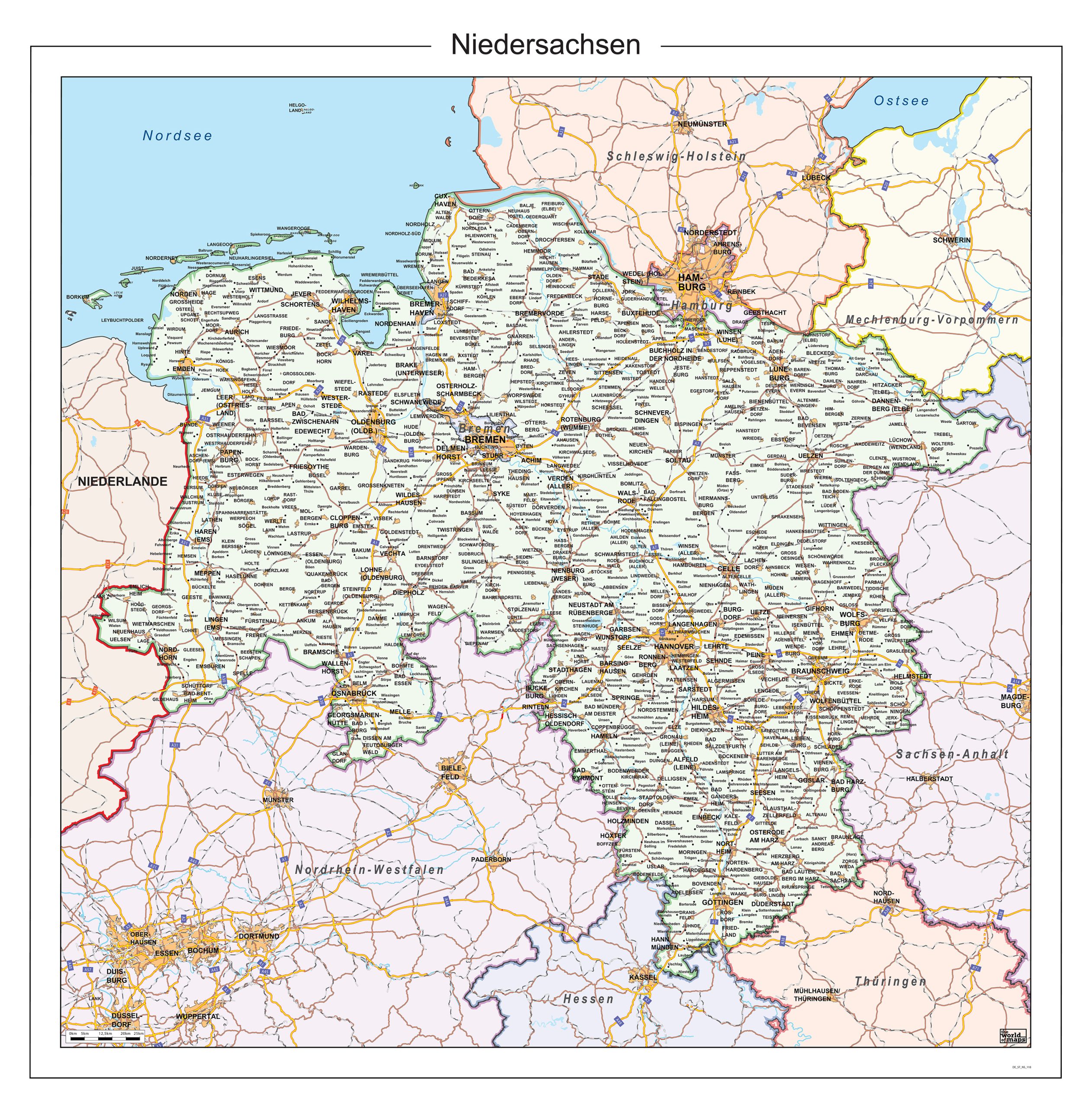 Staatkundige kaart van de Deelstaat Niedersachsen in prachtige pasteltinten.