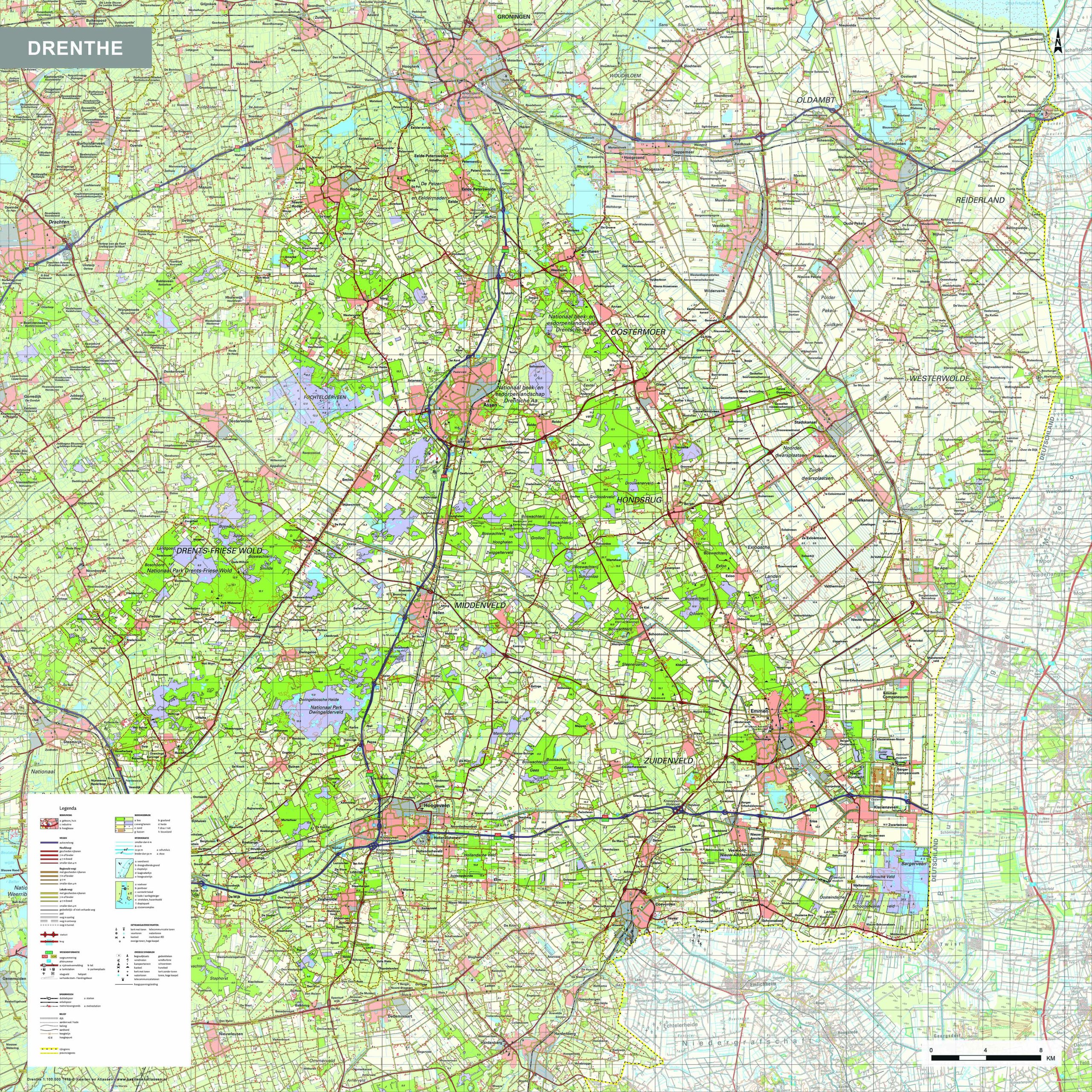 Provinciekaart van Drenthe waarop alle steden, dorpen en grotere gehuchten, wegen en wateren duidelijk zijn afgebeeld. De kaart bevat informatie zeer veel topografische informatie. Zo zijn bijvoorbeeld alle boerderijen, begraafplaatsen en windmolens afgebeeld. Van alle andere provincies zijn deze kaarten ook verkrijgbaar. Ook leverbaar zonder masker.