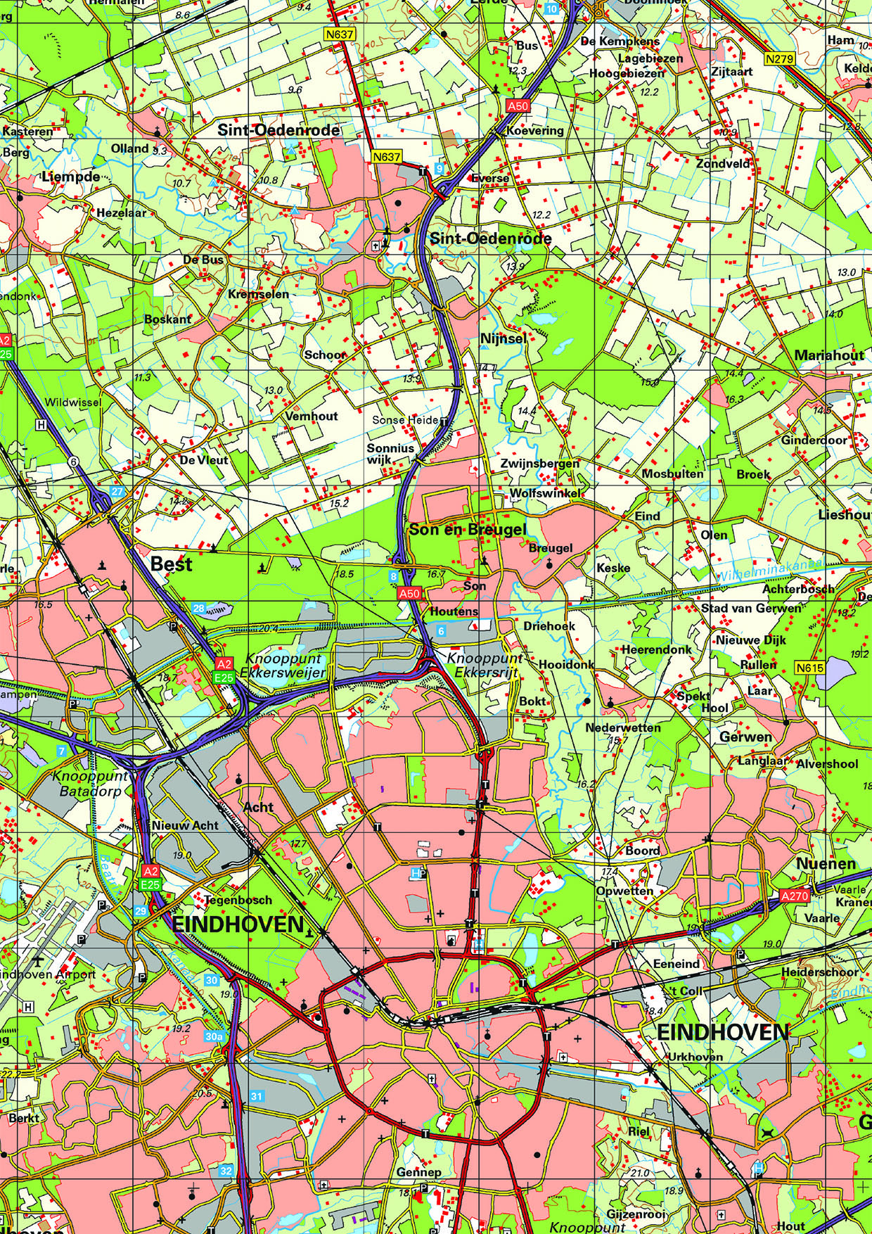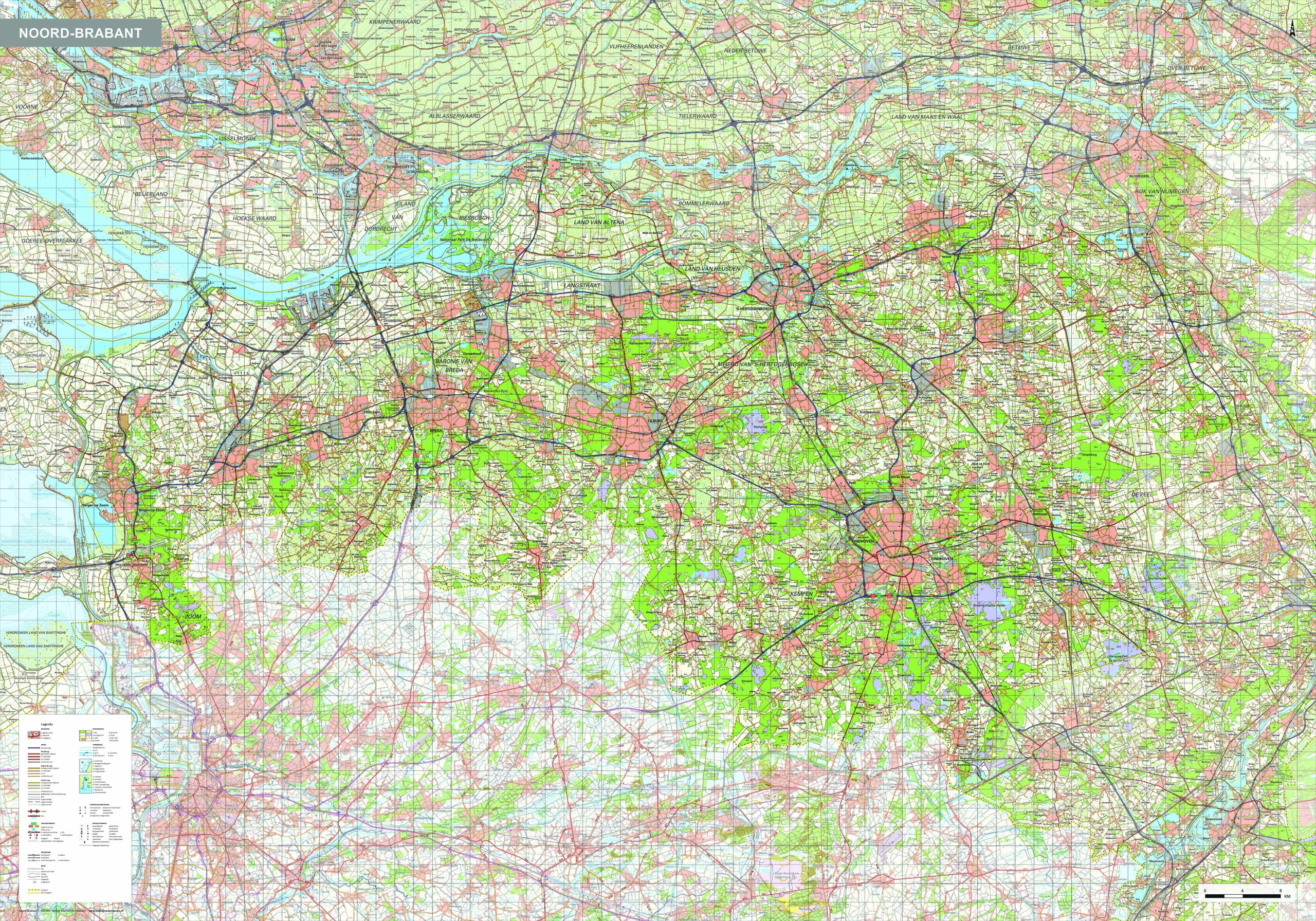 Provinciekaart van Noord-Brabant waarop alle steden, dorpen en grotere gehuchten, wegen en wateren duidelijk zijn afgebeeld. De kaart bevat informatie zeer veel topografische informatie. Zo zijn bijvoorbeeld alle boerderijen, begraafplaatsen en windmolens afgebeeld. Van alle andere provincies zijn deze kaarten ook verkrijgbaar. Ook leverbaar zonder masker.