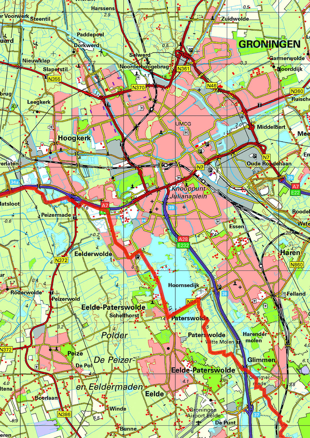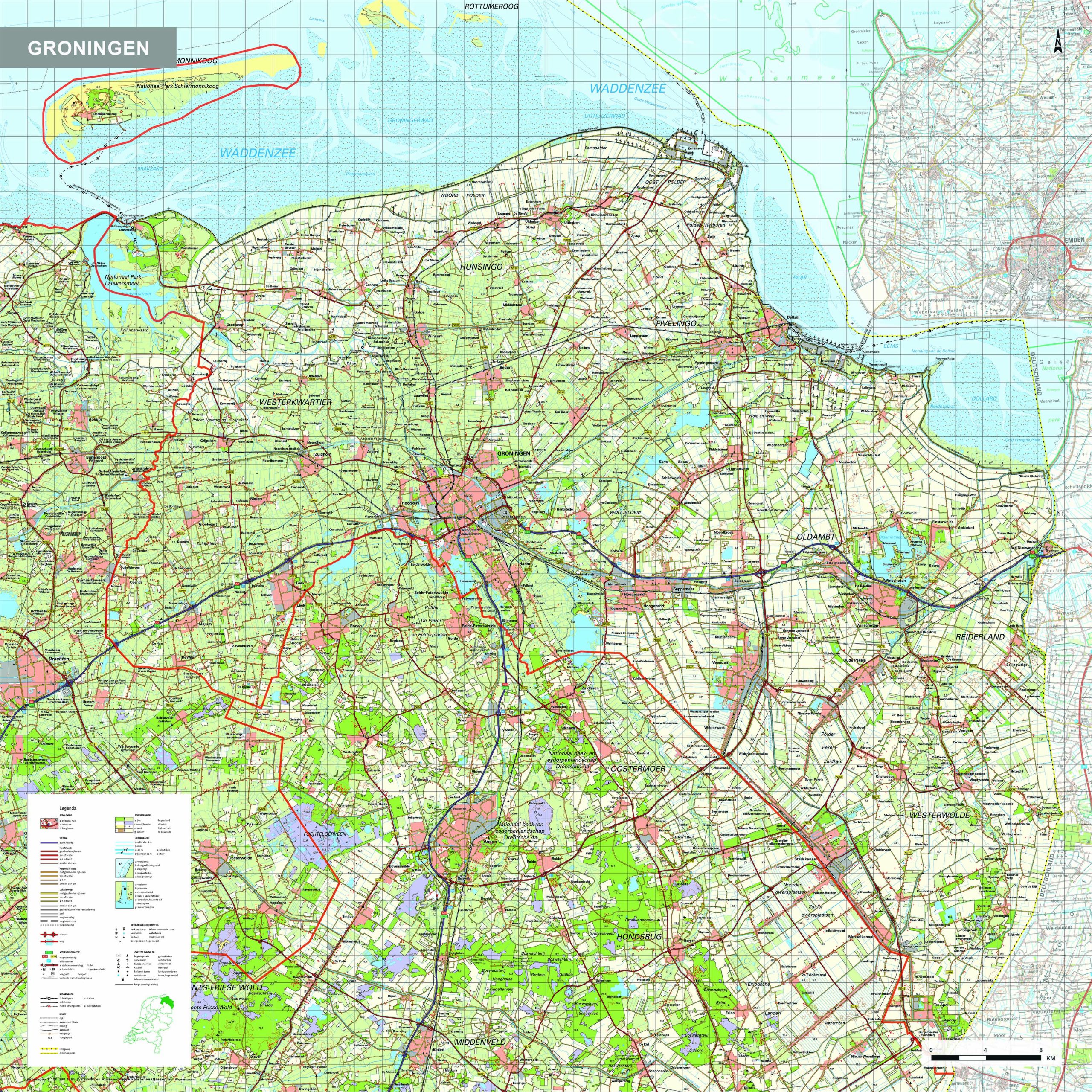 Provinciekaart van Groningen waarop alle steden, dorpen en grotere gehuchten, wegen en wateren duidelijk zijn afgebeeld. De kaart bevat informatie zeer veel topografische informatie. Zo zijn bijvoorbeeld alle boerderijen, begraafplaatsen en windmolens afgebeeld. Van alle andere provincies zijn deze kaarten ook verkrijgbaar. Ook als uitgelichte versie leverbaar.