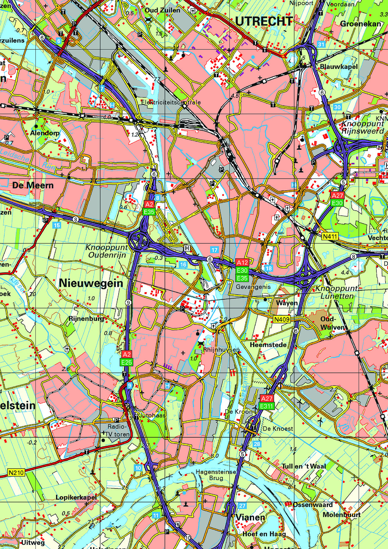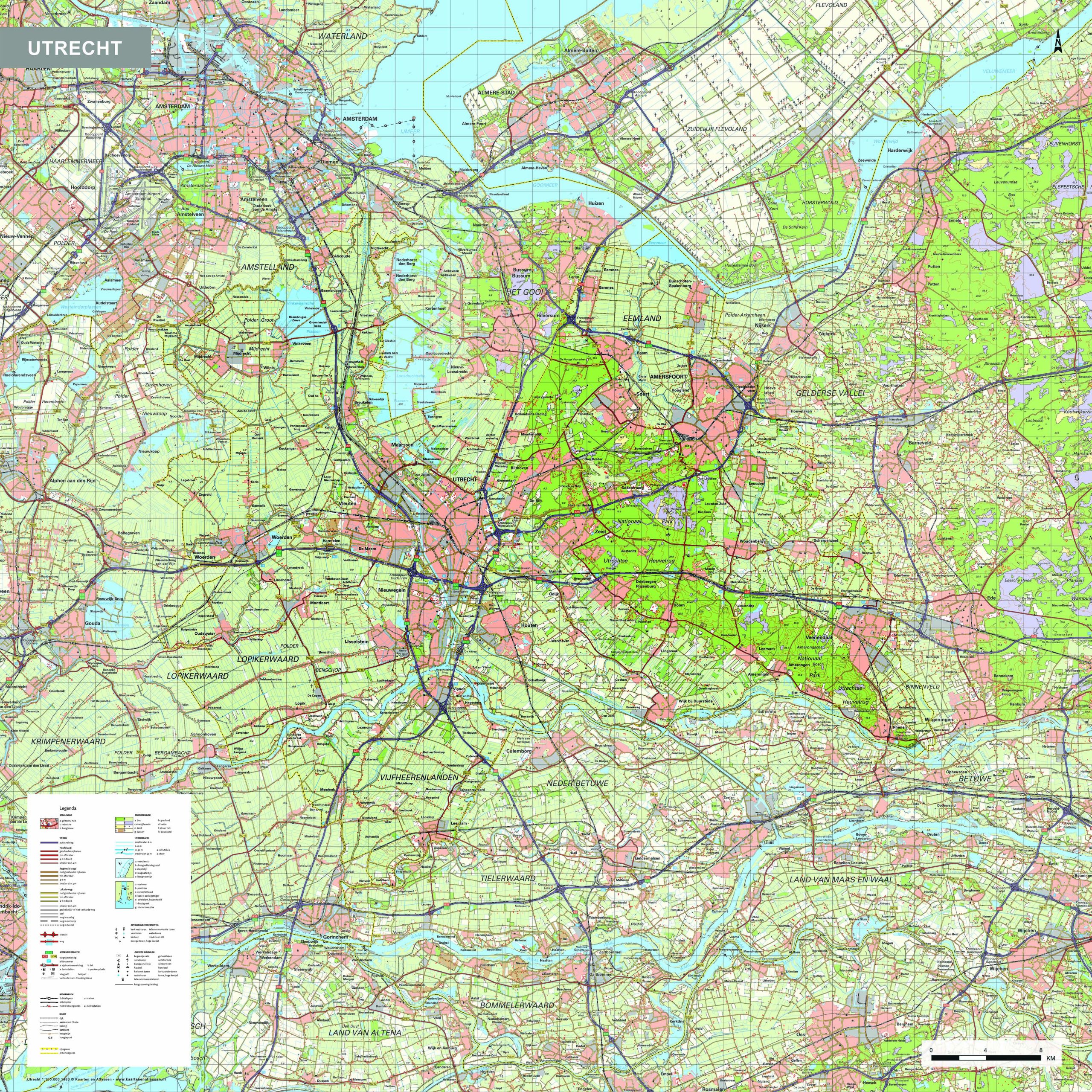 Provinciekaart van Utrecht waarop alle steden, dorpen en grotere gehuchten, wegen en wateren duidelijk zijn afgebeeld. De kaart bevat informatie zeer veel topografische informatie. Zo zijn bijvoorbeeld alle boerderijen, begraafplaatsen en windmolens afgebeeld. Uiteraard staat de meeste recente grenswijziging op de kaart. Van alle andere provincies zijn deze kaarten ook verkrijgbaar. Ook leverbaar zonder masker.