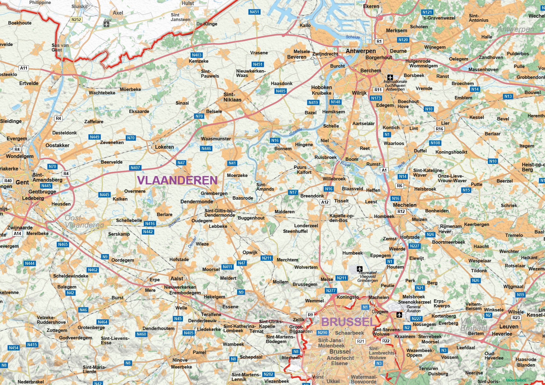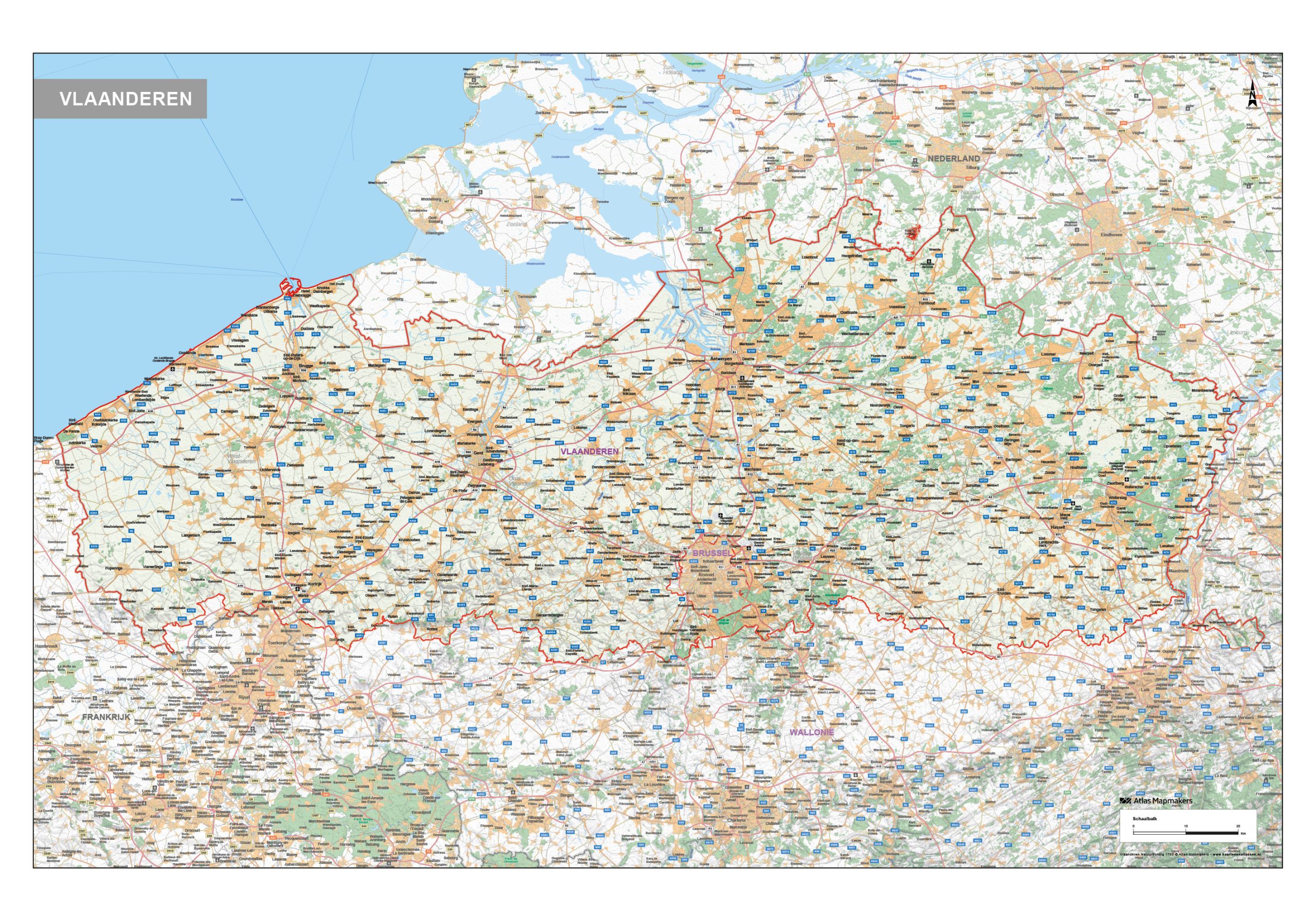 Zeer duidelijke en gedetailleerde kaart van Vlaanderen. De kaart bevat veel informatie. Plaatsen zijn duidelijk zichtbaar door de contouren. De kleuren geven het grondgebruik weer. Veel wegen staan op de kaart met hun wegnummer. Ook spoorwegen, wateren en luchthavens staan op de kaart. Bekijk ook eens onze staatkundige kaart van Vlaanderen 1751.