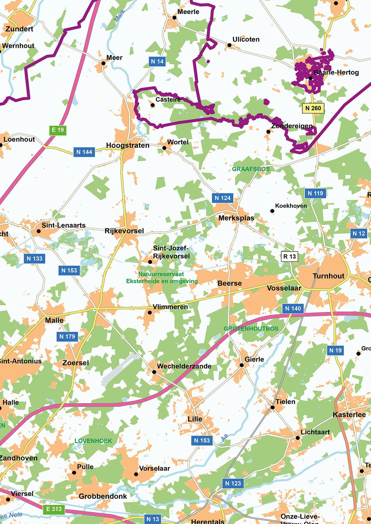 Een duidelijke regiokaart van Zuid Nederland. Veel plaatsen en dorpen, wegen, snelwegen, spoorlijnen en wateren staan op de kaart. De provinciegrenzen en het grondgebruik zijn goed zichtbaar.
