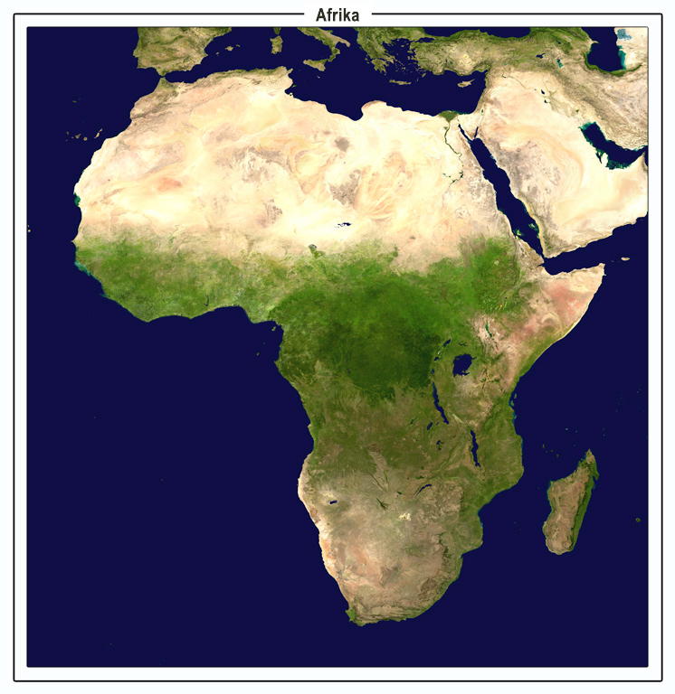 Klassiek satellietbeeld van Afrika. Door de natuurlijke kleuren is prachtig het grondgebruik zichtbaar.