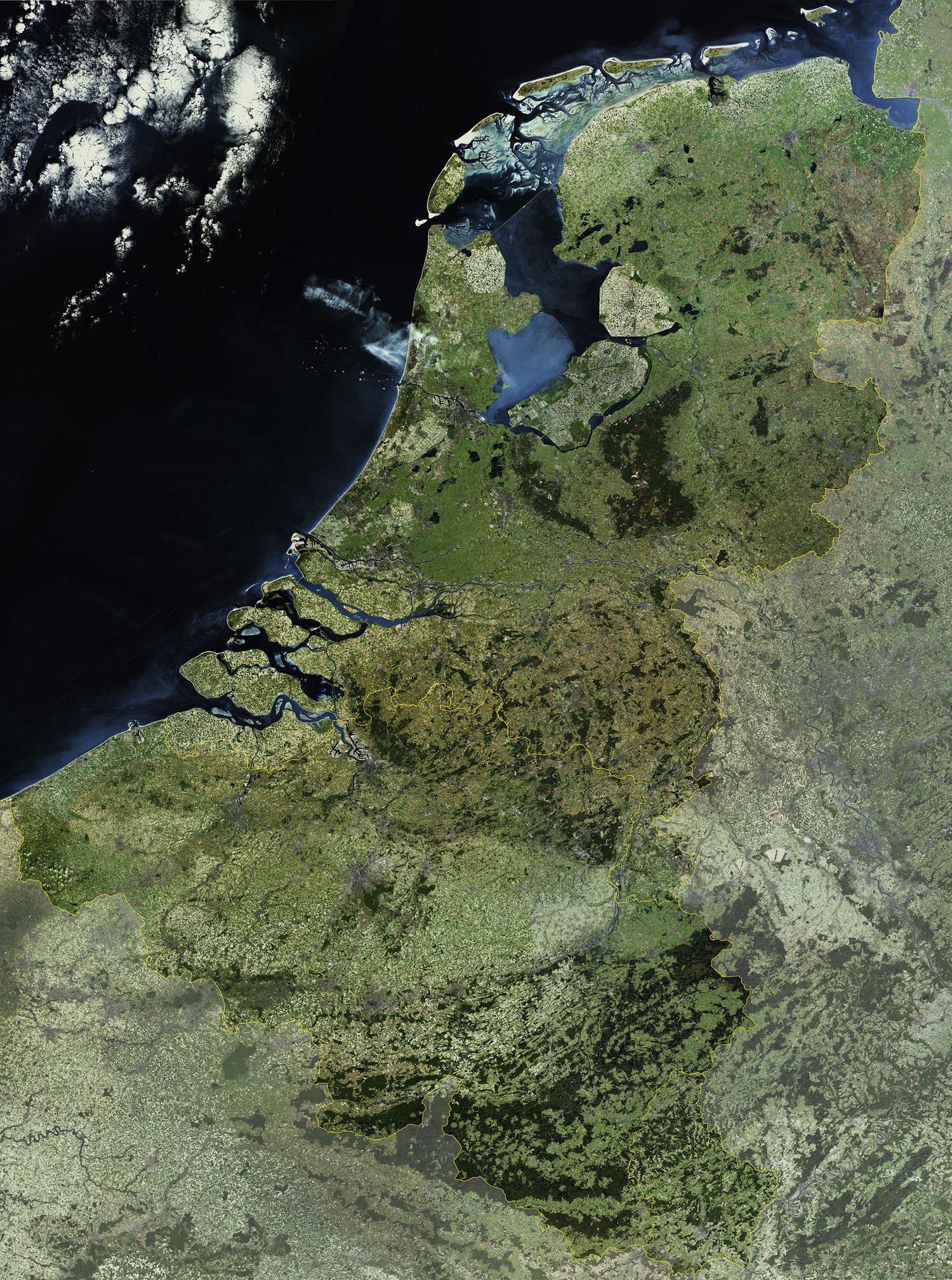 Satellietkaart van de Benelux in natuurlijke kleuren. Heel de Benelux is uitgelicht zodat de grenzen duidelijk zichtbaar zijn.