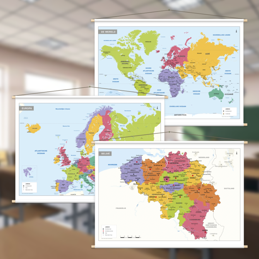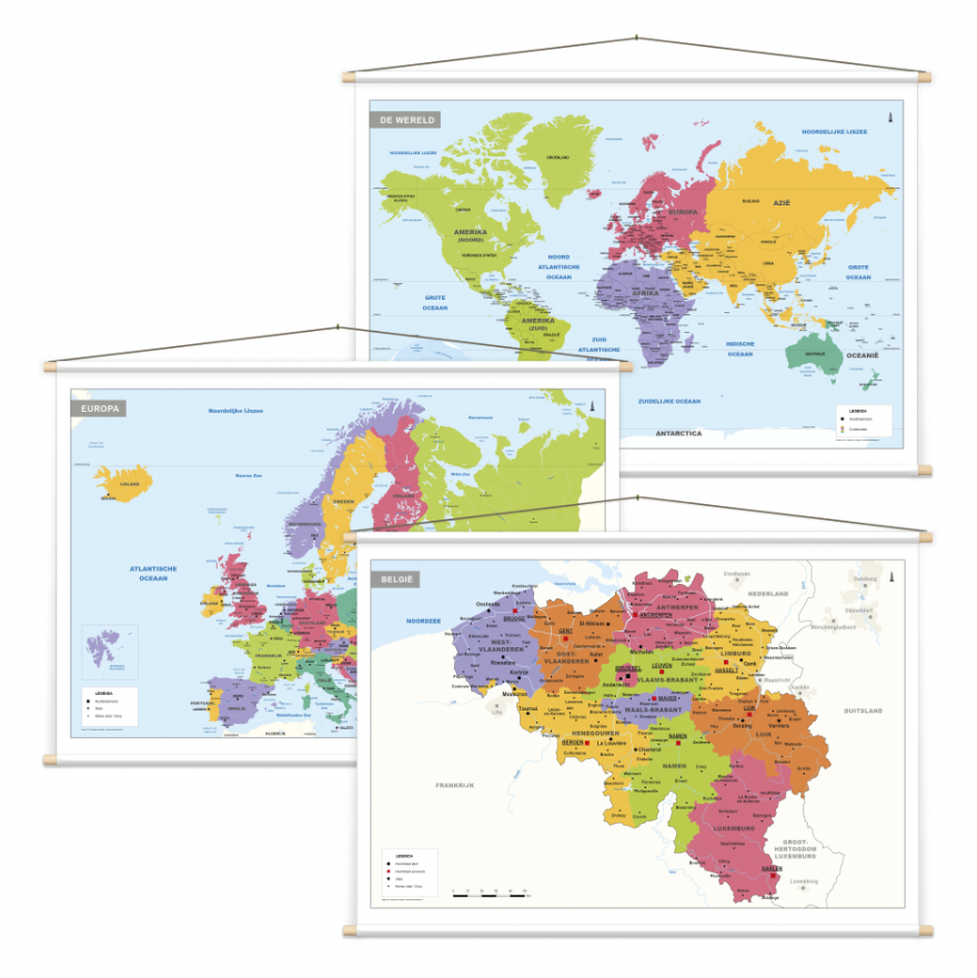 Zeer duidelijk en helder vormgegeven kaarten van België, Europa en de Wereld. Ideaal voor gebruik op scholen. De kaarten wordt standaard gedrukt op bisonyl (vrachtwagenzeil) met houten stokken als ophangsysteem. De kaarten zijn daardoor jarenlang te gebruiken, makkelijk op te rollen en uit te rollen. De kaarten hebben mooie kleuren, de vormgeving is eenvoudig en de teksten zijn goed leesbaar.