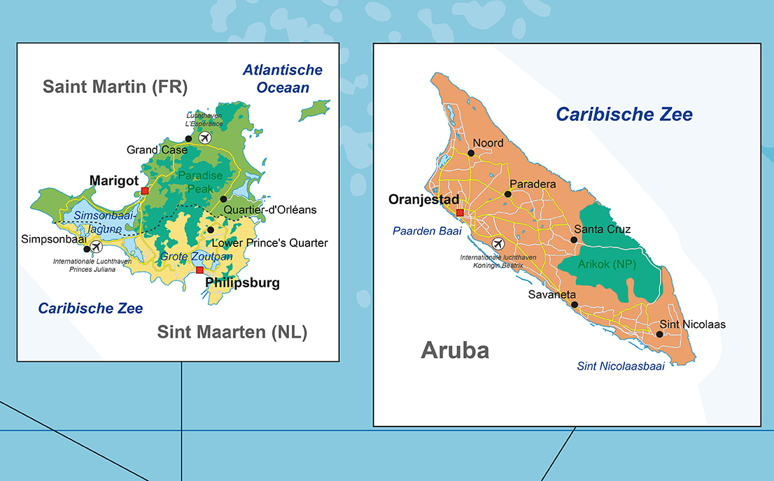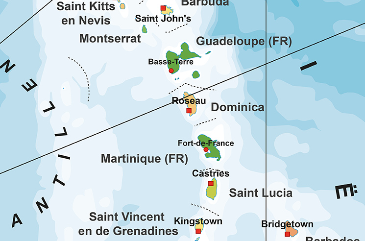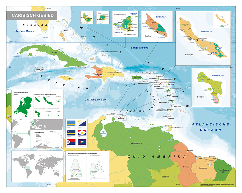 Een duidelijke kaart van het Caribisch gebied. De kaart is heel duidelijk en geeft toch heel veel informatie omdat er uitvergrootte uitsneden van de eilanden op de kaart toegevoegd zijn. Zo zijn heel veel eilandnamen afgebeeld, alle provincies, heel veel steden, de belangrijkste wegen en andere details zoals vlaggen, weergegeven. Kortom een heel mooie kaart waar wij als uitgever best trots op zijn.