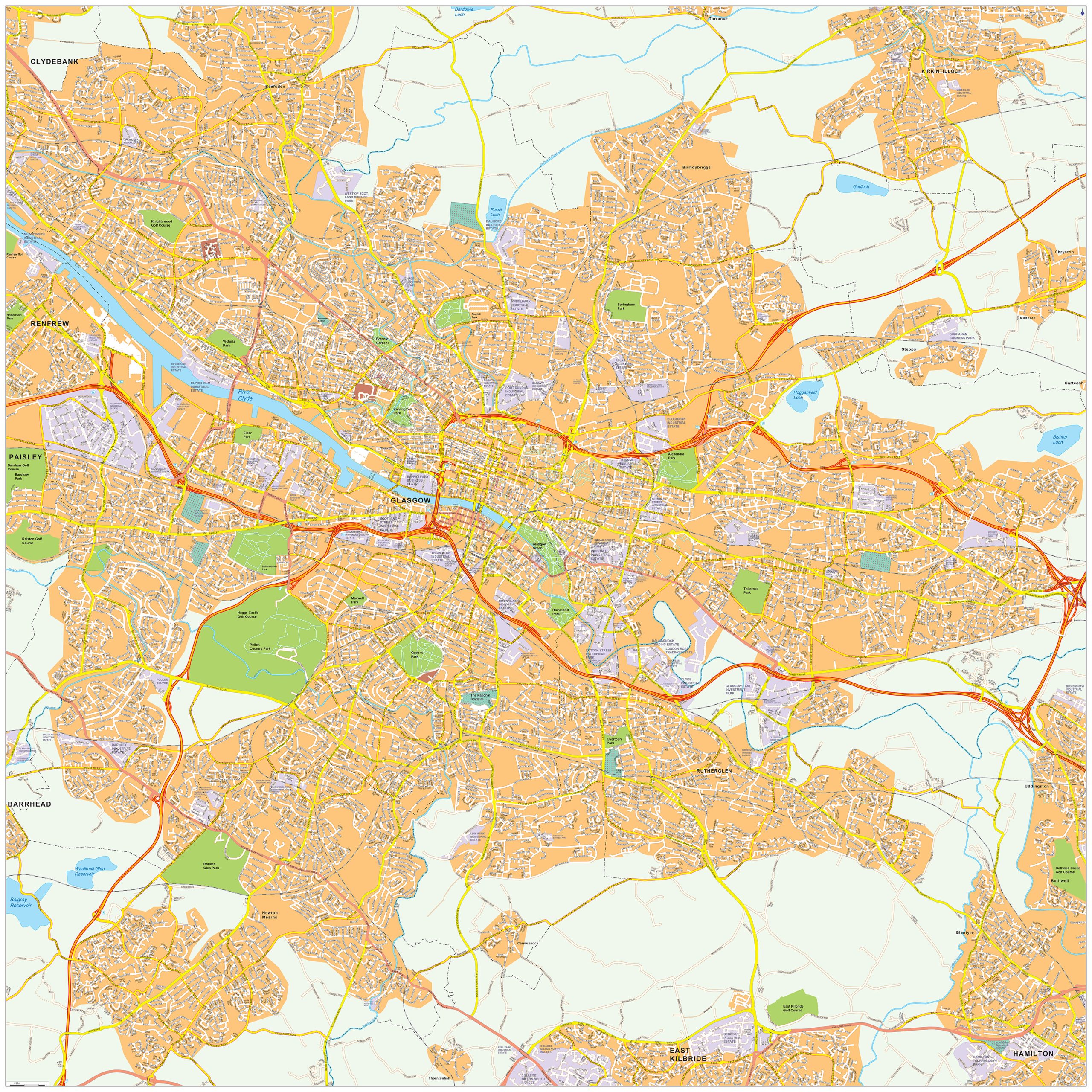 Straatnamenkaart van Glasgow. Geeft op een zeer duidelijke manier bijna alle straten weer.